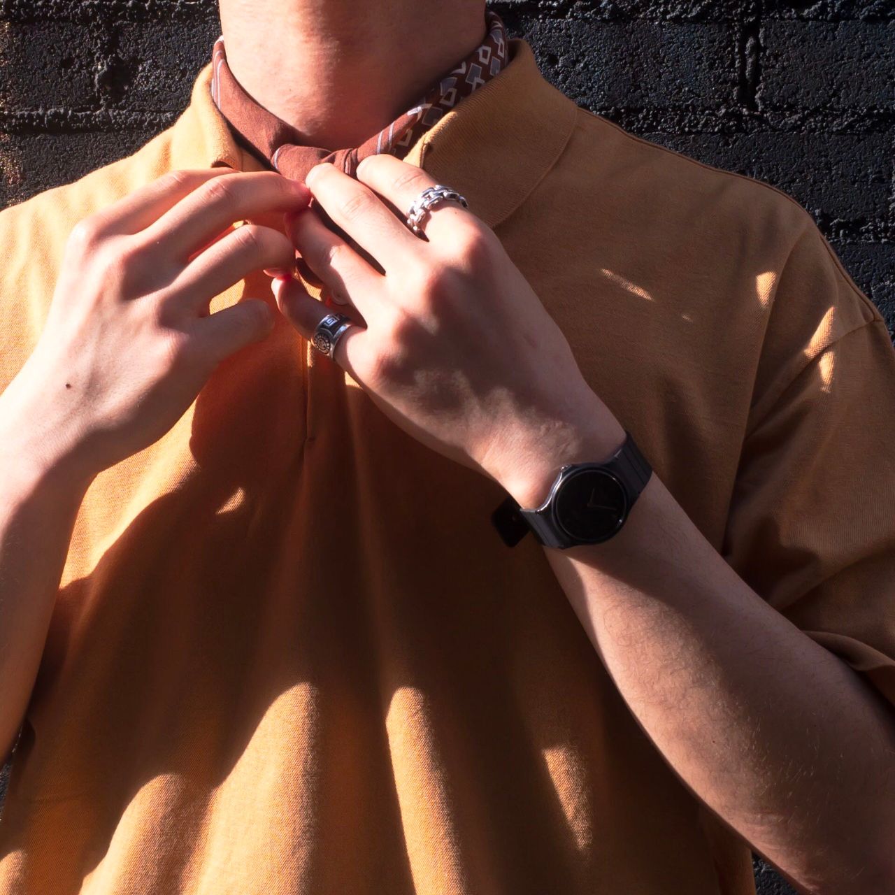 首元にバンダナやチーフを入れて一捻り