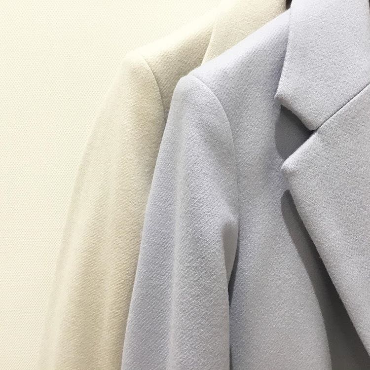 メンズ仕立てのチェスターコートの中に柔らかい色味で女性らしさを落とし込んだおつくり。