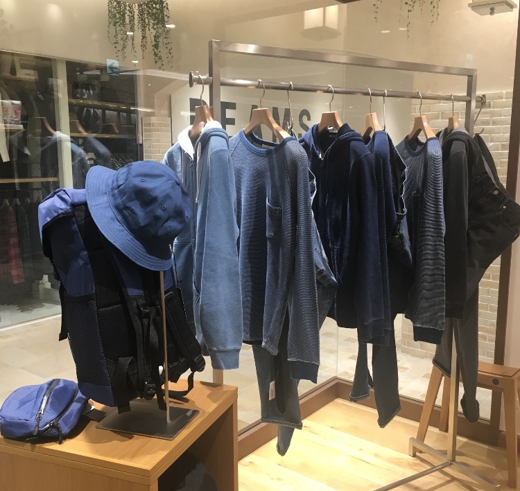 一際統一感があって目立つコーナーがメンズに 設置されてるではありませんか! そうです、インディゴコーナーです!! ブルーのコントラストがとっても綺麗ですよね。 この素敵なブルーを生み出すインディゴは 古くから親しまれている染料で 染める前の状態は茶色、それから空気に触れ酸化し このブルーを生み出すのです! 他には食品添加物、着色料に使われたりなど用途は様々。。。