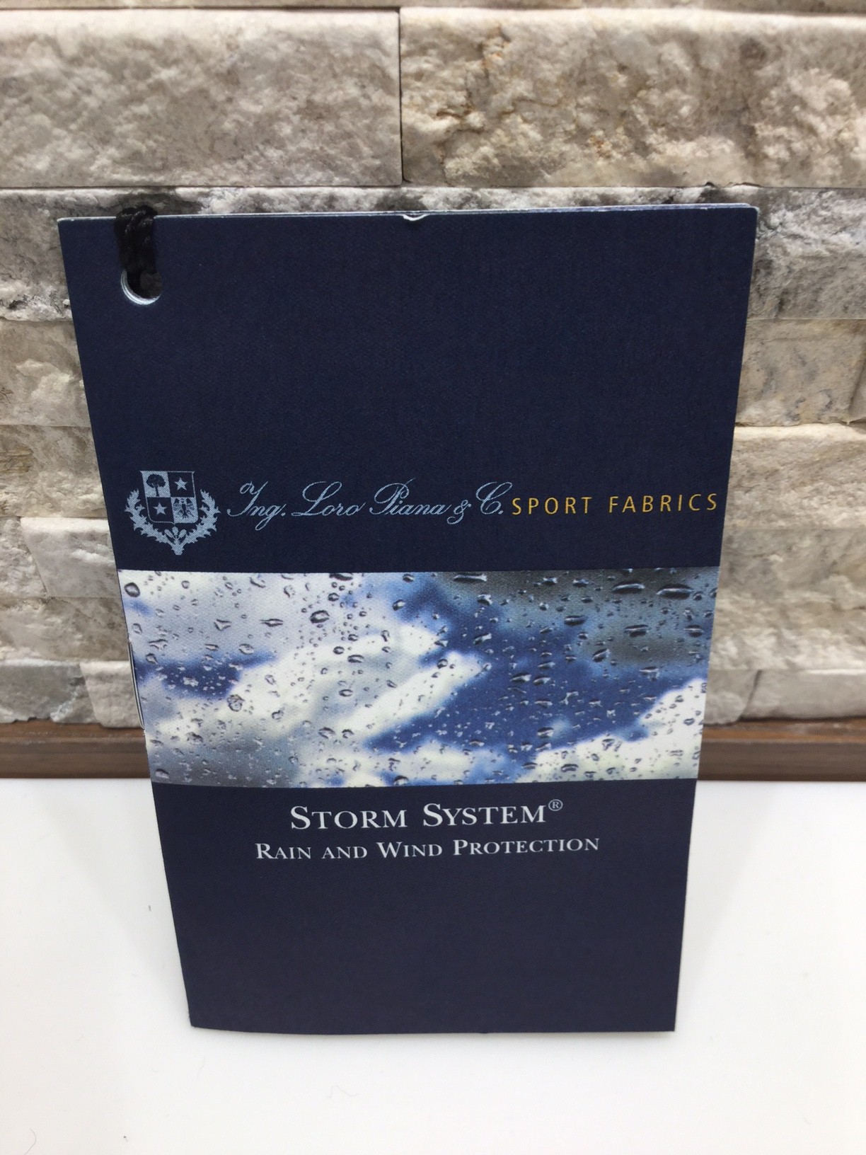【STORM SYSTEM】: ストームシステムはレインシステムの撥水加工と、防水・透湿・防風の機能を兼ね備えた独自の無孔質皮膜による二重のバリアで構成されています。このミクロ分子で作られている無孔質皮膜は、生地の裏に張り合わせられており、高品質で上品なロロピアーナの生地の雰囲気はそのままに、撥水性がありながら卓越した通気性を兼ね備え、軽量で、伸縮性と耐久性に優れています。