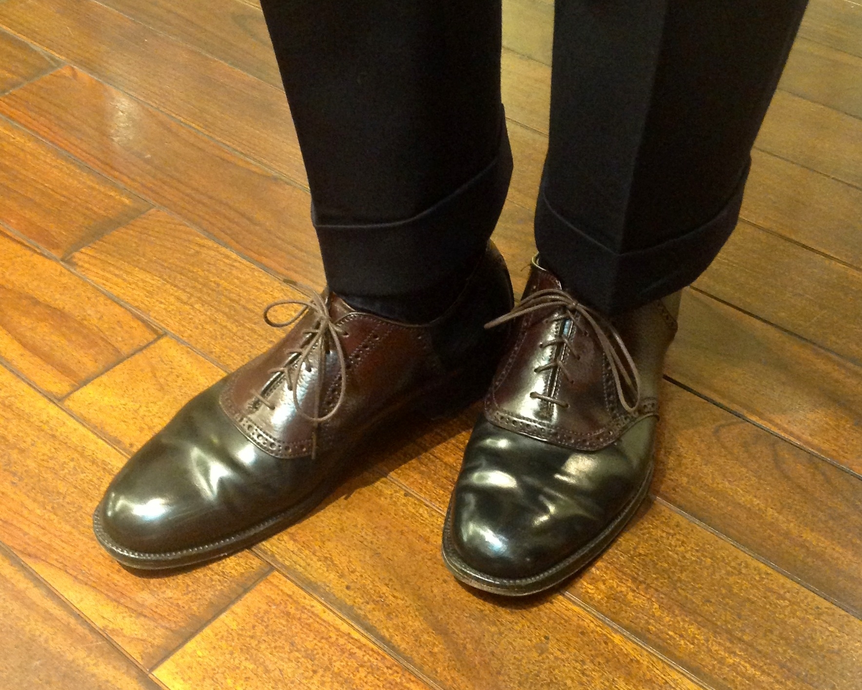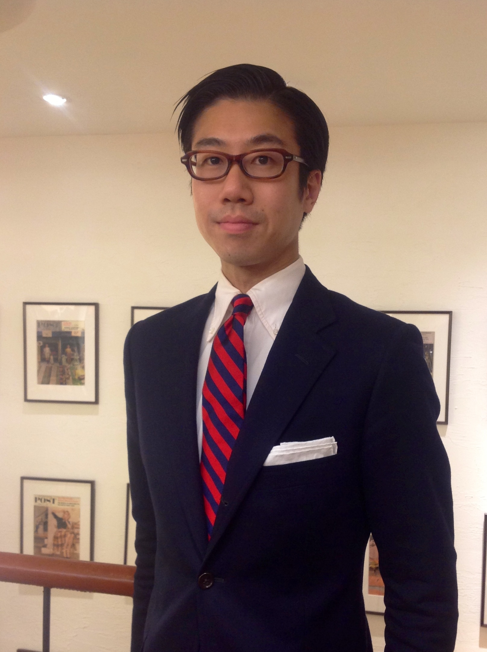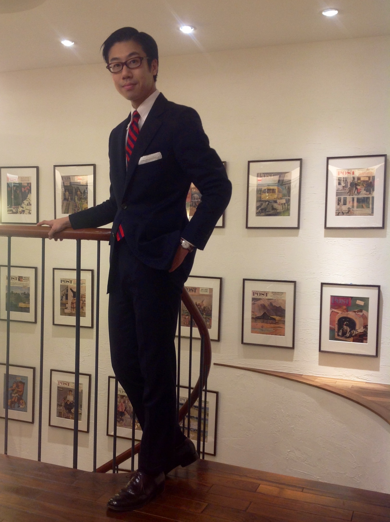 ヨウジヤマモトの黒いスーツと白いブラウス、