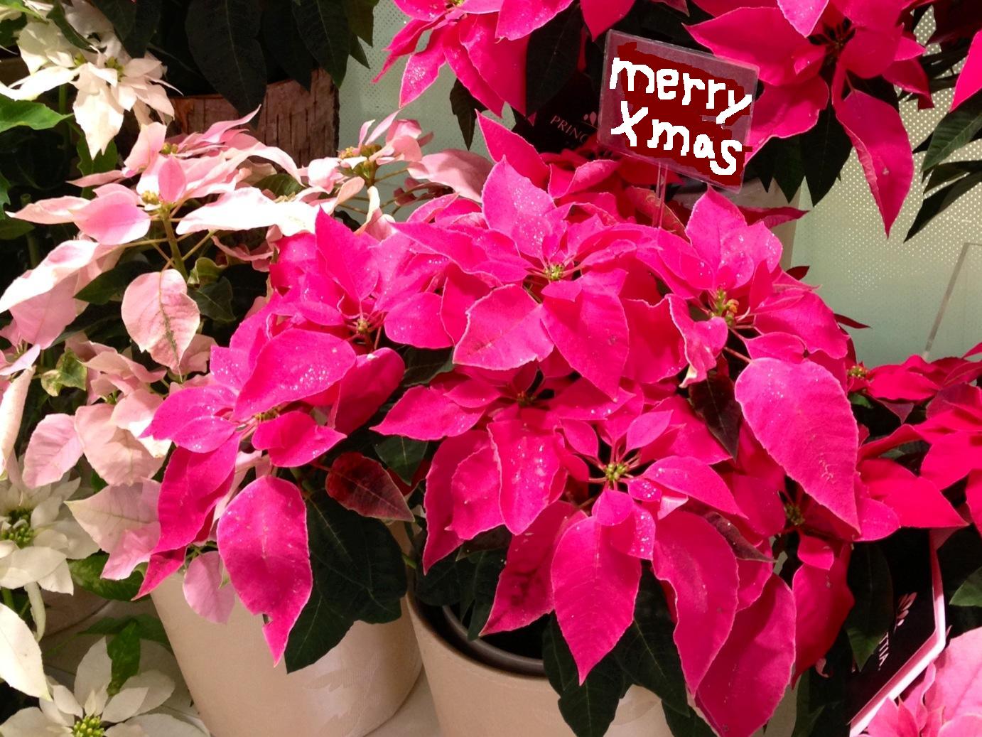 ポインセチアが花屋の店先を彩り、