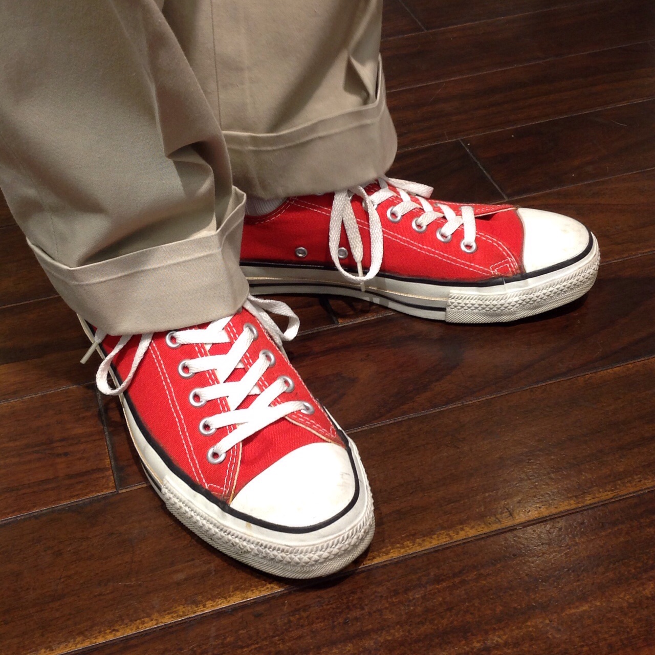 赤いチャックテイラー履いて