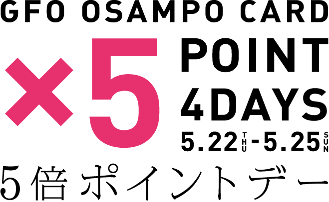 ※OSAMPOカードご利用のお客様で1会計税込100円以上のお買い物が対象 ※通常100円で1ポイントのところ、100円につき5倍の5ポイント ※500ポイント毎に500円相当としてそのままお支払いにご利用可能。 ※OSAMPOカードは取扱店にて即日発行可能 ※入会費・年会費無料