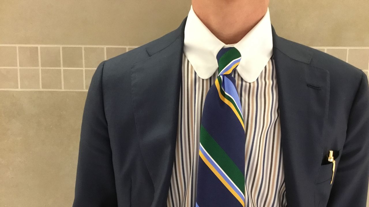 ワイドカラーのシャツは男性のスーチングを最も雄々しくみせてくれる襟型のひとつ。