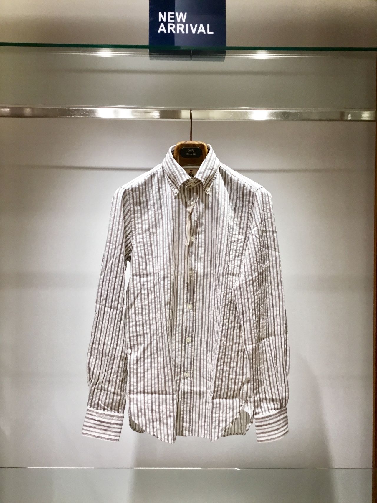 お次は、カーキのストライプのシャツです。同じくボタンダウン仕様ですが、こちらはウォッシュドコットン100%となっております。
