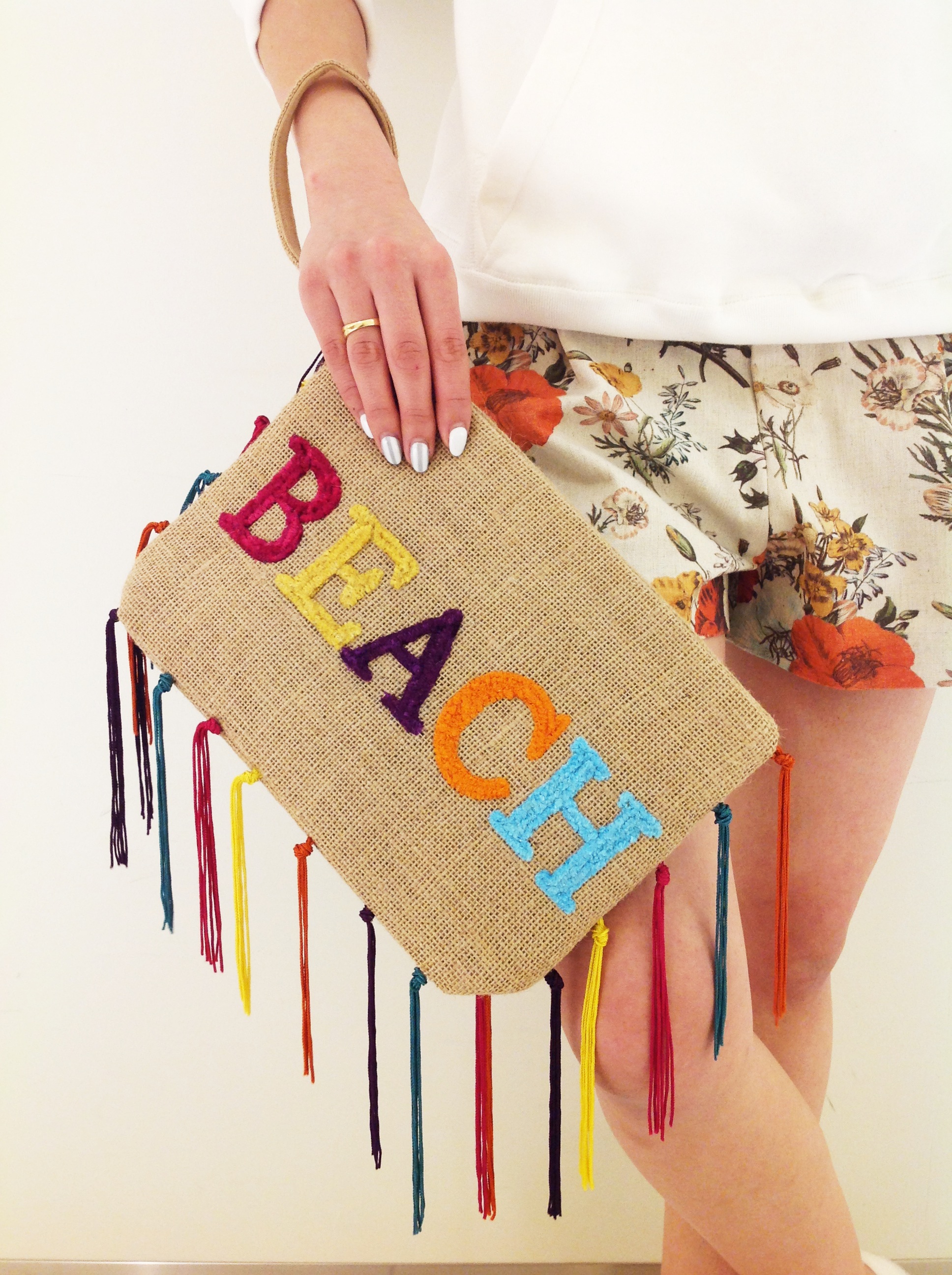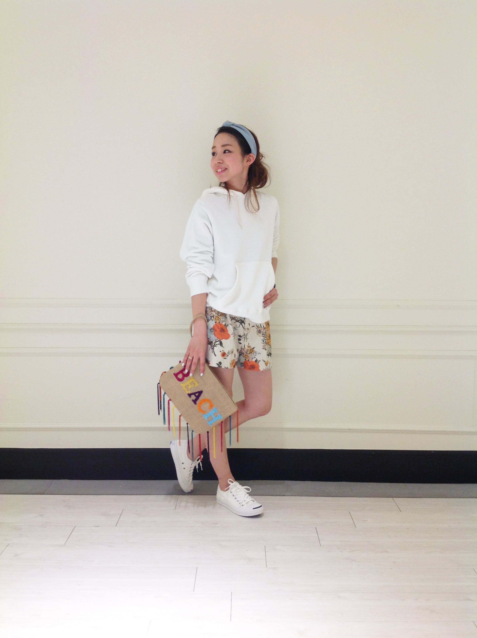 白を基調にしたシンプルなコーディネートに映える、BEACHのロゴとフリンジ。