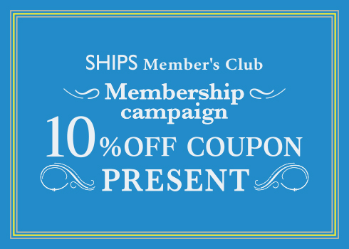 全国のシップス各店にて「シップスメンバーズクラブメンバーシップキャンペーン」を開催! 期間中、お買い上げいただいたうえ、SHIPS Member's Clubへ新規ご加入頂きましたお客様に、 6月2日(月)~8月31日(日)の期間にお使いただける10%OFFクーポンをプレゼントいたします。 ぜひ、この機会をご利用ください。