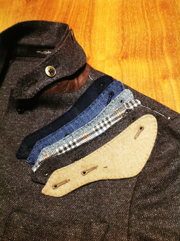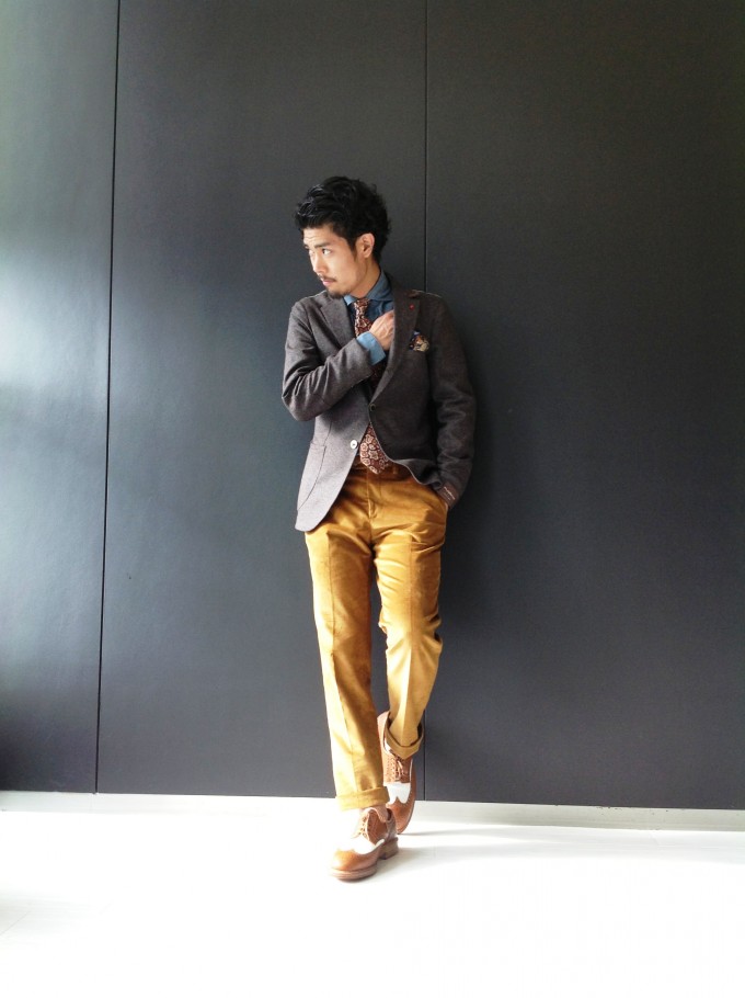 同生地のエルボーパッチや襟ぐりに付くチンストラップのハンティング要素のアクセントが、今期のトレンドでもある英国調な雰囲気を醸し出します。ハンティングのアクセントがデニムなどのカジュアルな合わせにもしっかりはまってくれます。