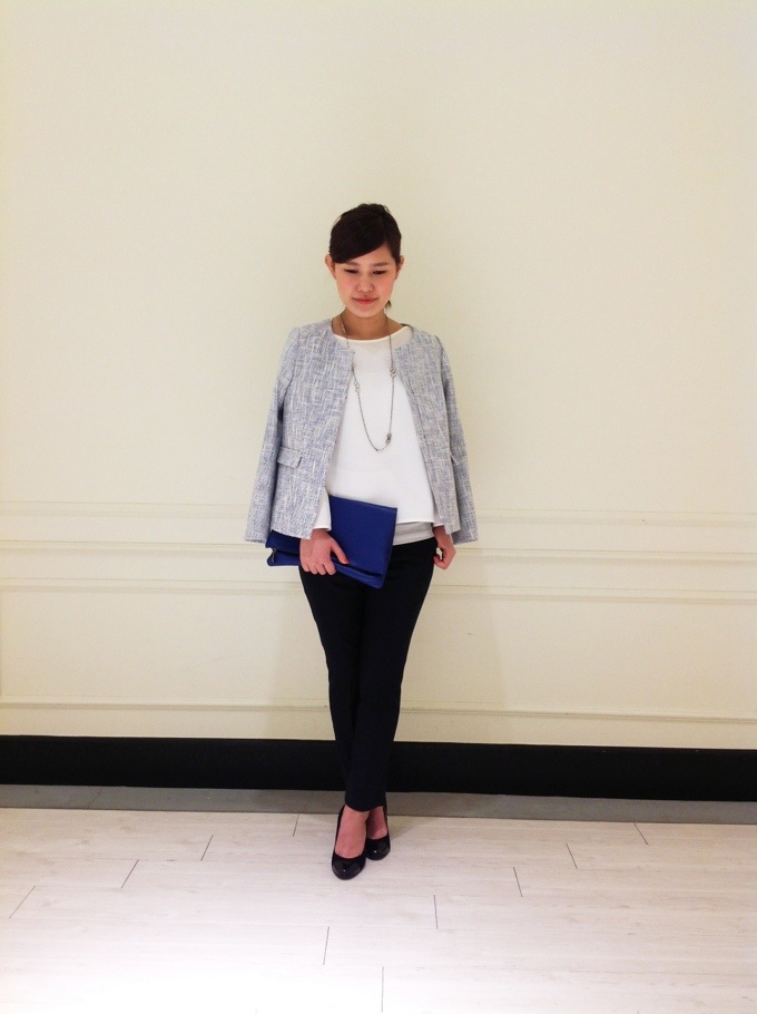 ワンピースからトップスとパンツに替えるだけで、ワークスタイルの完成。全体をブルーでまとめスタイリッシュな雰囲気に。