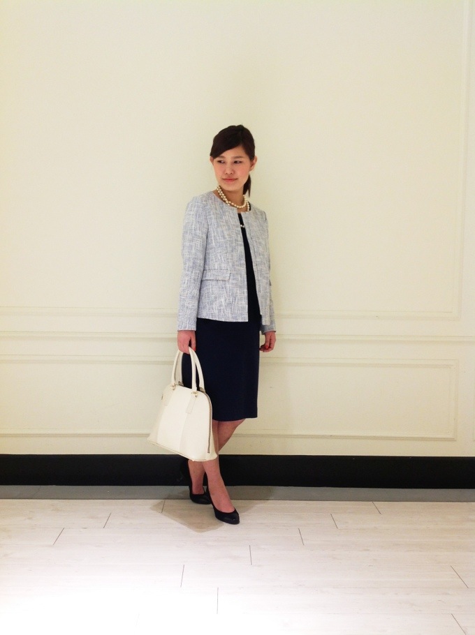 腰回りにペプラムデザインのあるシンプルなワンピースにジャケットを羽織るだけでマザーニーズスタイルの完成。アクセサリーと小物を今季キーカラーにもなる白でまとめて更に春らしく。