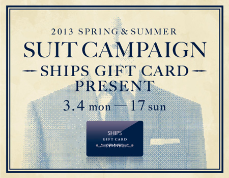 期間中、スーツを含め8万4000円(税込・加工代を除く)以上購入すると、翌日からご利用頂ける5000円分のSHIPS GIFT CARDをプレゼントしています。 自分のために使うのもよし!!大切なあの人のために使うのもよし!! あなたの平和のために、SHIPS のGIFT CARDを使ってやってください(^^)