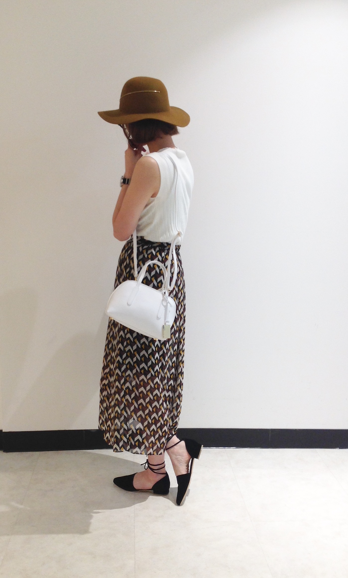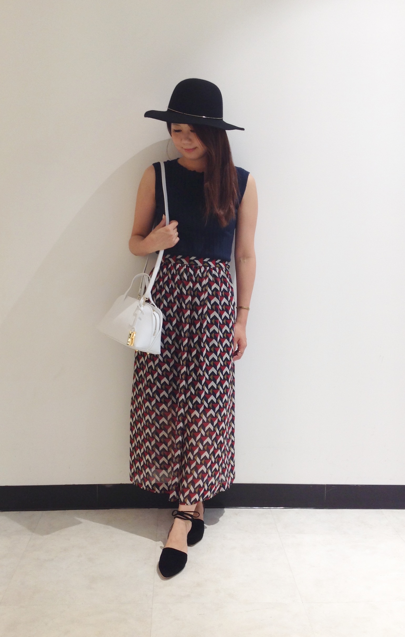 幾何学模様のスカートは長め丈がポイント。