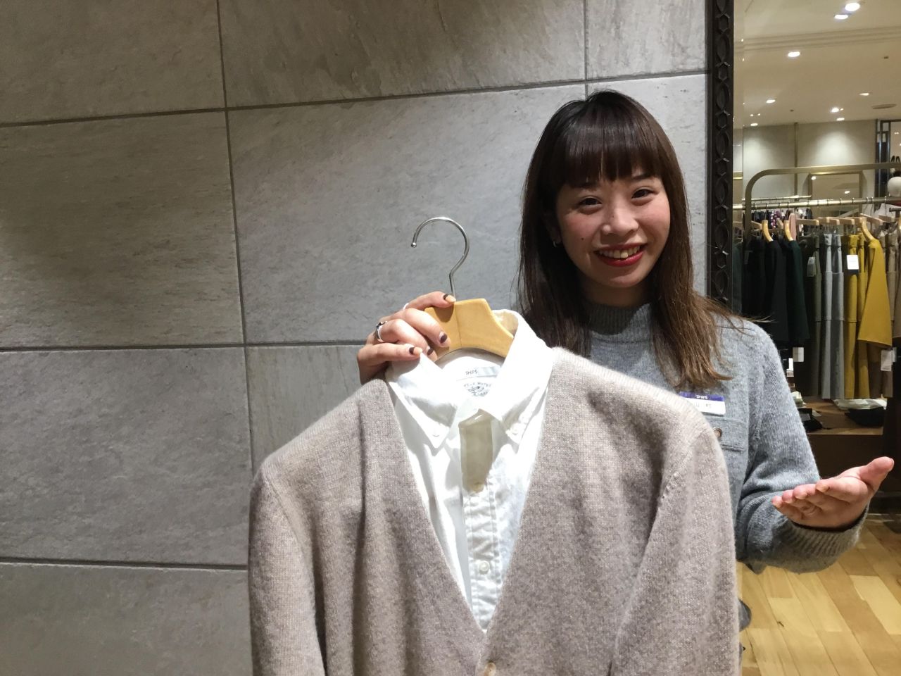 カシミヤカーデとオックスフォードの白シャツ。