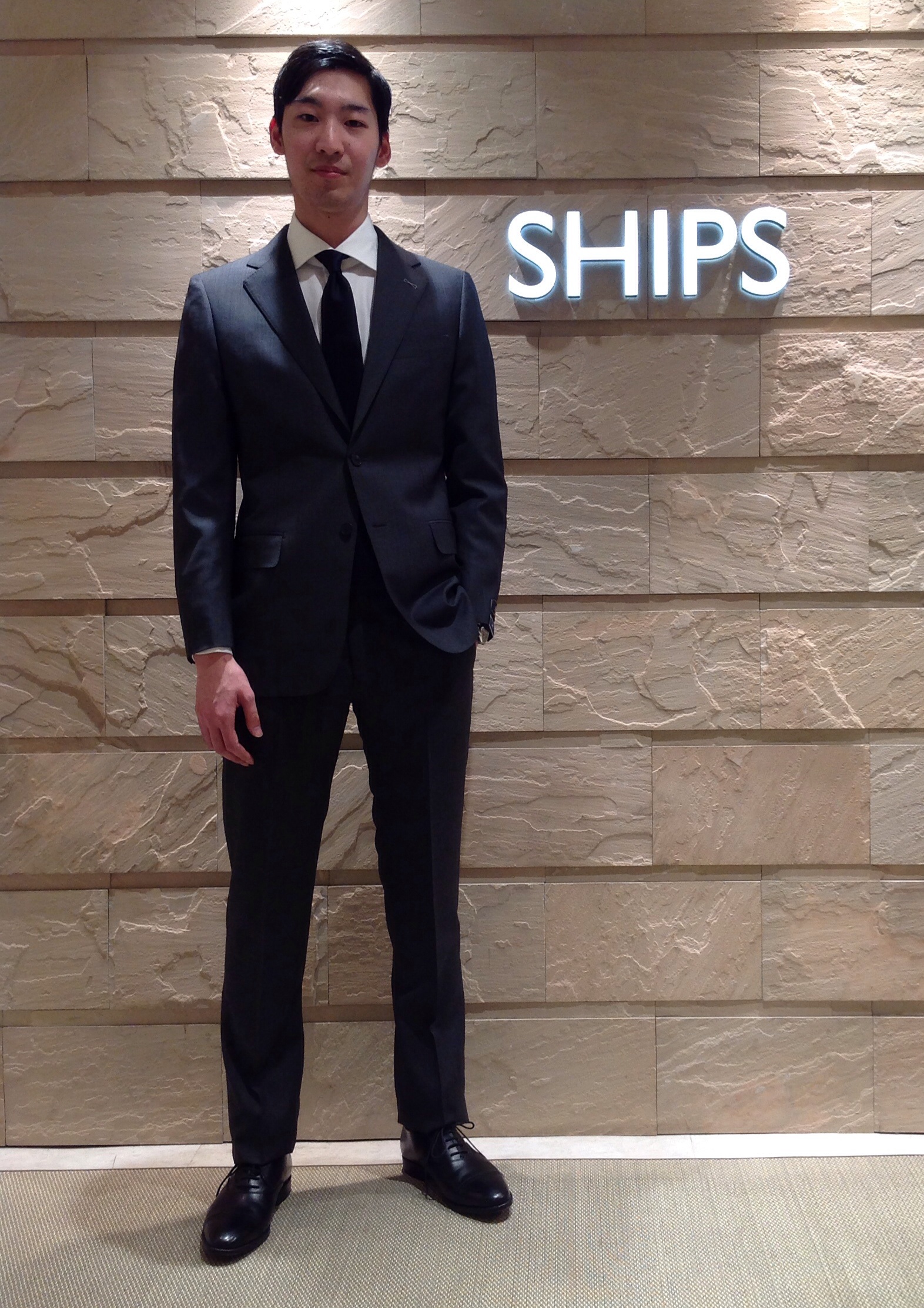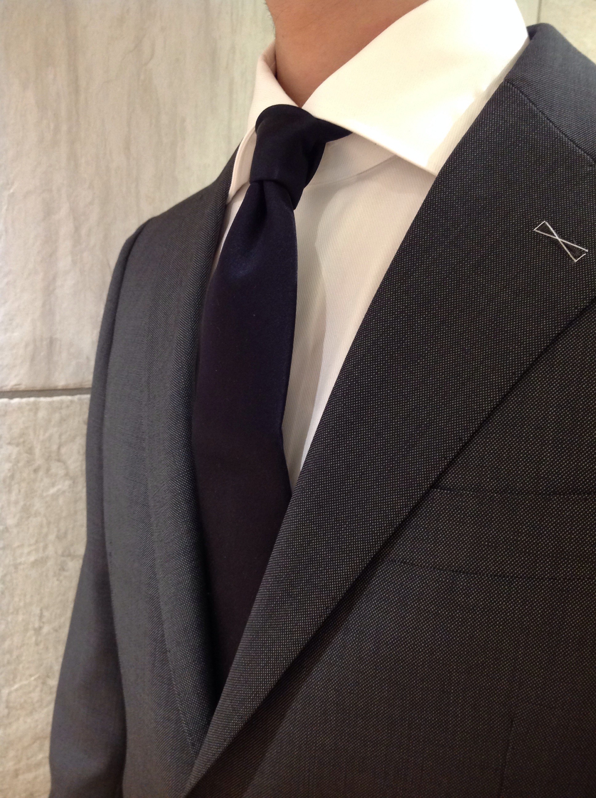 今度はシンプルに、チャコールグレーのスーツに白シャツ、ダークネイビーのタイ。