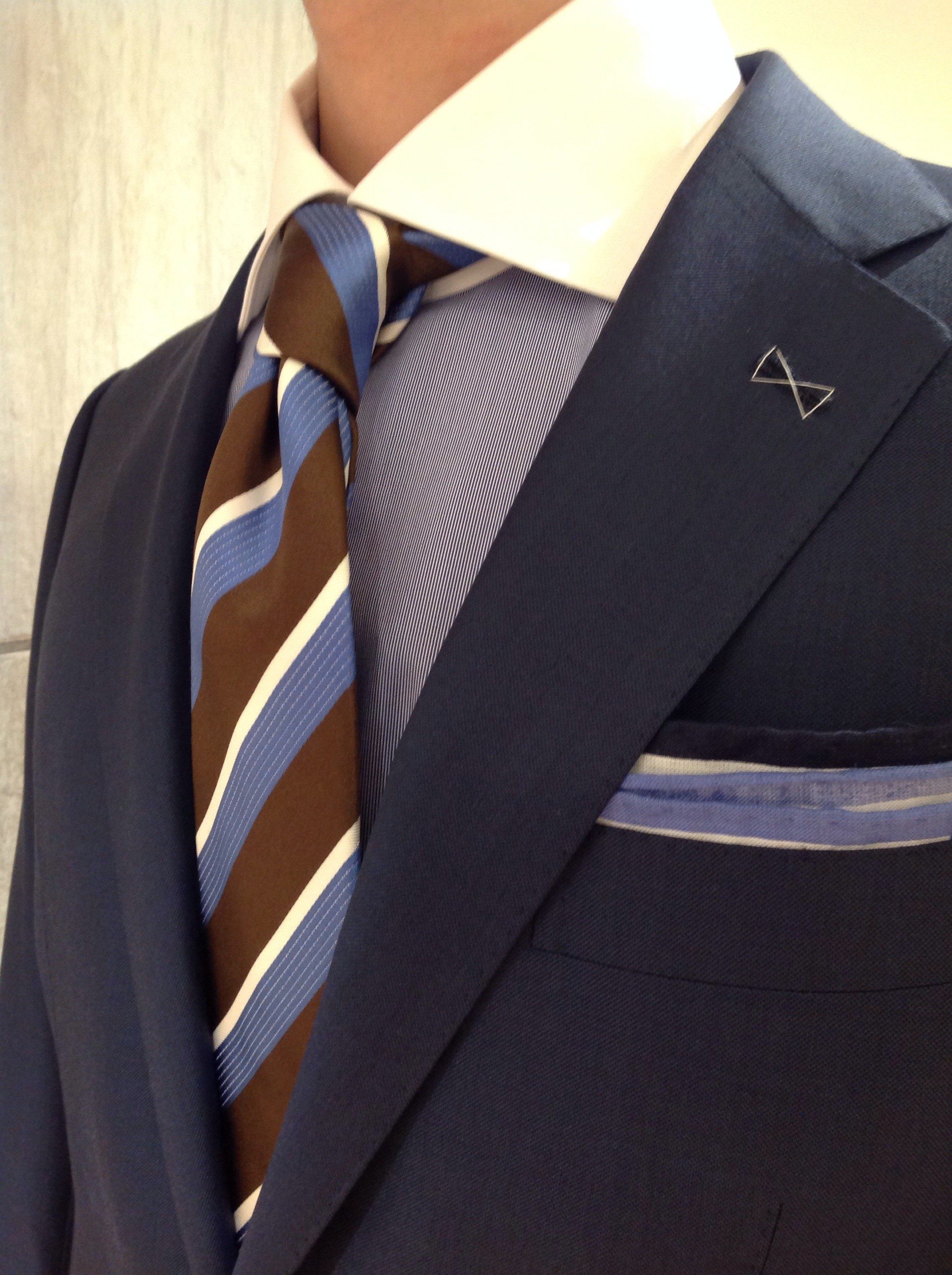 スーツ、シャツ、タイ、チーフをすべてブルーに統一。ブルーが出すフレッシュな印象。
