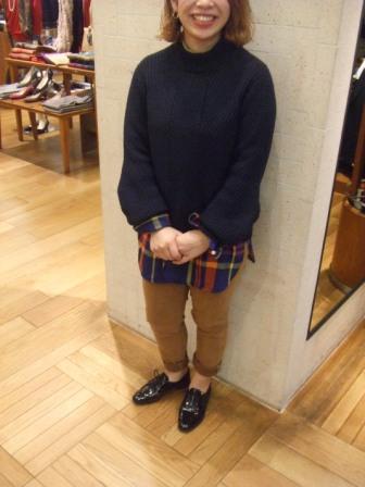 SHIRTS:FWK by ENGINEERED GARMENTS ¥26,250(left、center) ¥19,950(right) FWK by ENGINEERED GARMENTSは、 古き良きアメリカのクラシックテーラリングや、ワーク、ミリタリー といったウェアのディテイルを現代的に再構築し、 世界でも人気の高い、MADE IN NEW YORKのJAPANブランド、 ENGINEERED GARMENTSのウィメンズラインです。 今回ご紹介するロングシャツは、 メンズラインの定番、19thB.D.SHIRTと、WORK SHIRTSを、 ウィメンズらしいフィットとロング丈でアレンジしたモデル。 ちょうどヒップがすっぽり隠れるくらいの着丈で、 シャツワンピとしては少し短いですが、 これからの時期に出番のふえるニットやベストなどとの 重ね着のアクセントとしてぴったりの長さです。 さっそくスタッフYに着てもらいました。