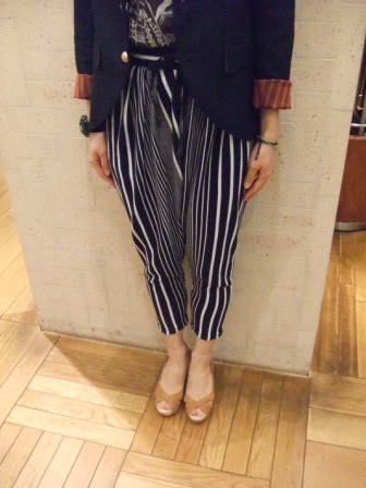いわゆるサルエル風とでもいいましょうか。 ヒップからワタリにかけてはゆったりと、 そこから裾に向かってぎゅっとテーパードしたシルエット。 リラックス感満載ですが、上品な雰囲気なので、 画像のように紺ブレなんかのハズシで穿いてもらうと カワユイんじゃないかと思います。 きゃわわです(おじさん無理して若者用語を使ってみました)。 今回もざっくりご案内してみました。 先日ご紹介したMAJESTICはすでに店頭でも品薄になっておりますので、 気になられた方はぜひお早めに♪ カネコでした。