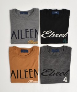 新しい秋物のニットです!その前面にタイトルの名前がデザインされています! ちなみに「おてんば」も「セクシー」もただの語感といいますか、イメージです(笑) 実際には、二つの名前にはそれぞれちゃんと意味があって、 Aileenは 楽しい とか 美しい Ebrelは 4月 という意味なんだそうです。