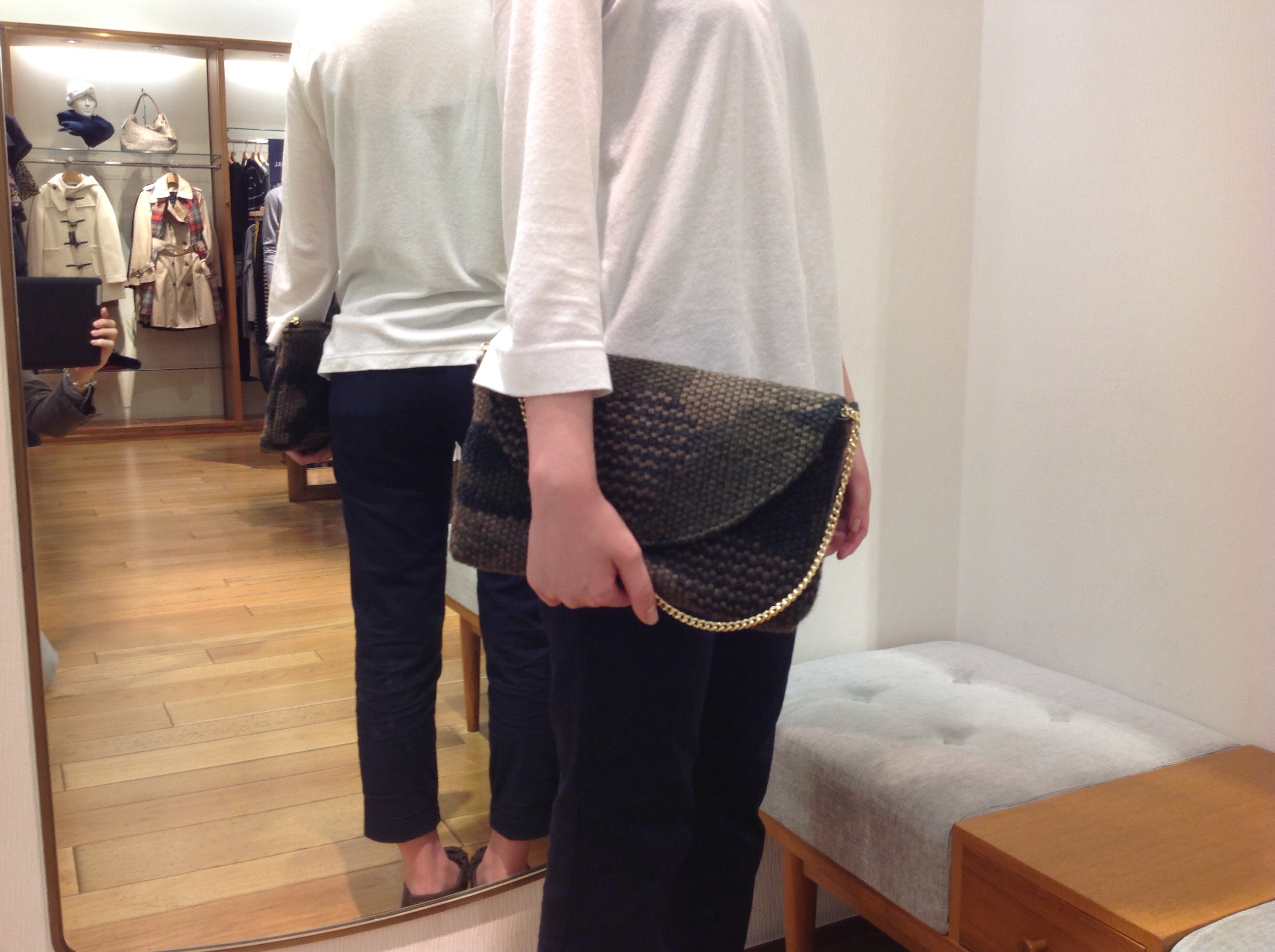 BERTINI: 2WAY フラップ クラッチ ¥13,000(+TAX) ウール感が強めに出ているんですが、 意外とフォーマルスタイルともハマっちゃいます! ちなみに店頭ではただいまこの様にディスプレイされています。
