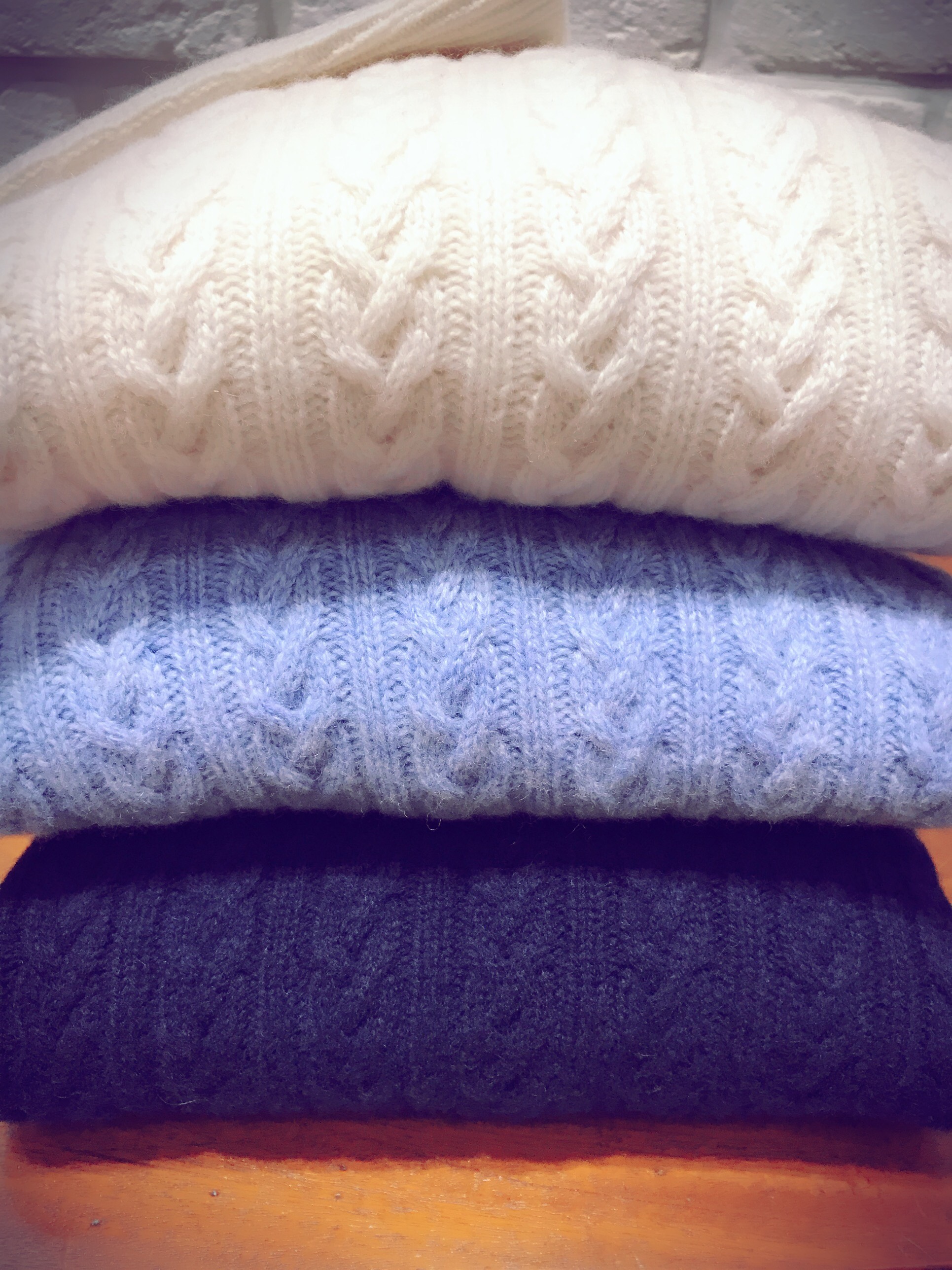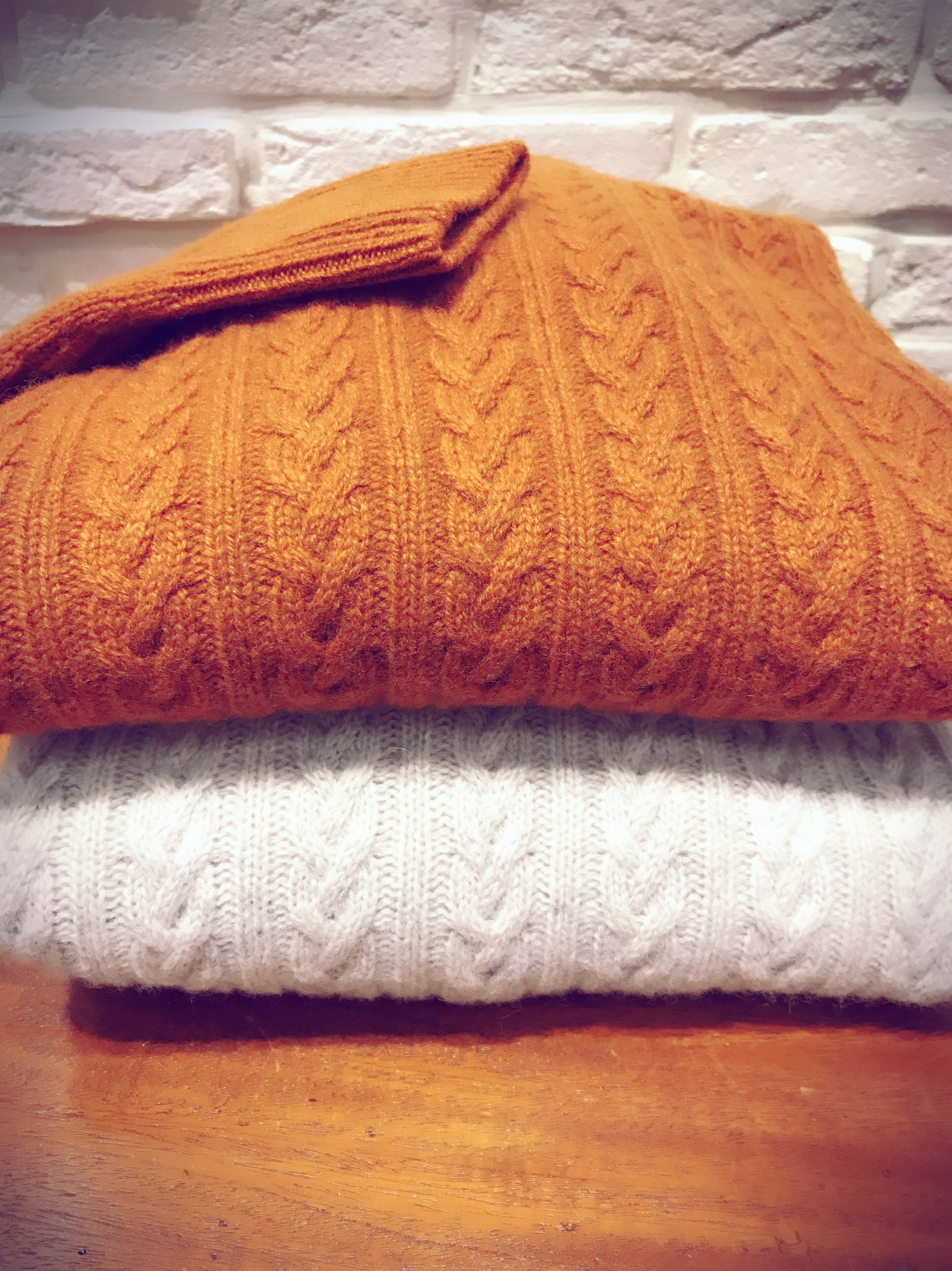 ケーブル編みが可愛いニット。 白ボトムで合わせて爽やかにスタイリング。 カシミヤ混であたたかく、今からの寒い時期に大活躍間違いない! 柔らかい肌触りが着心地も◎
