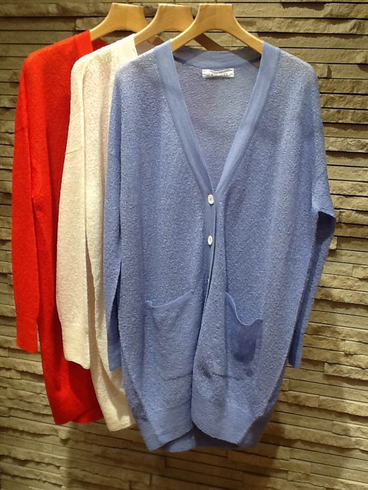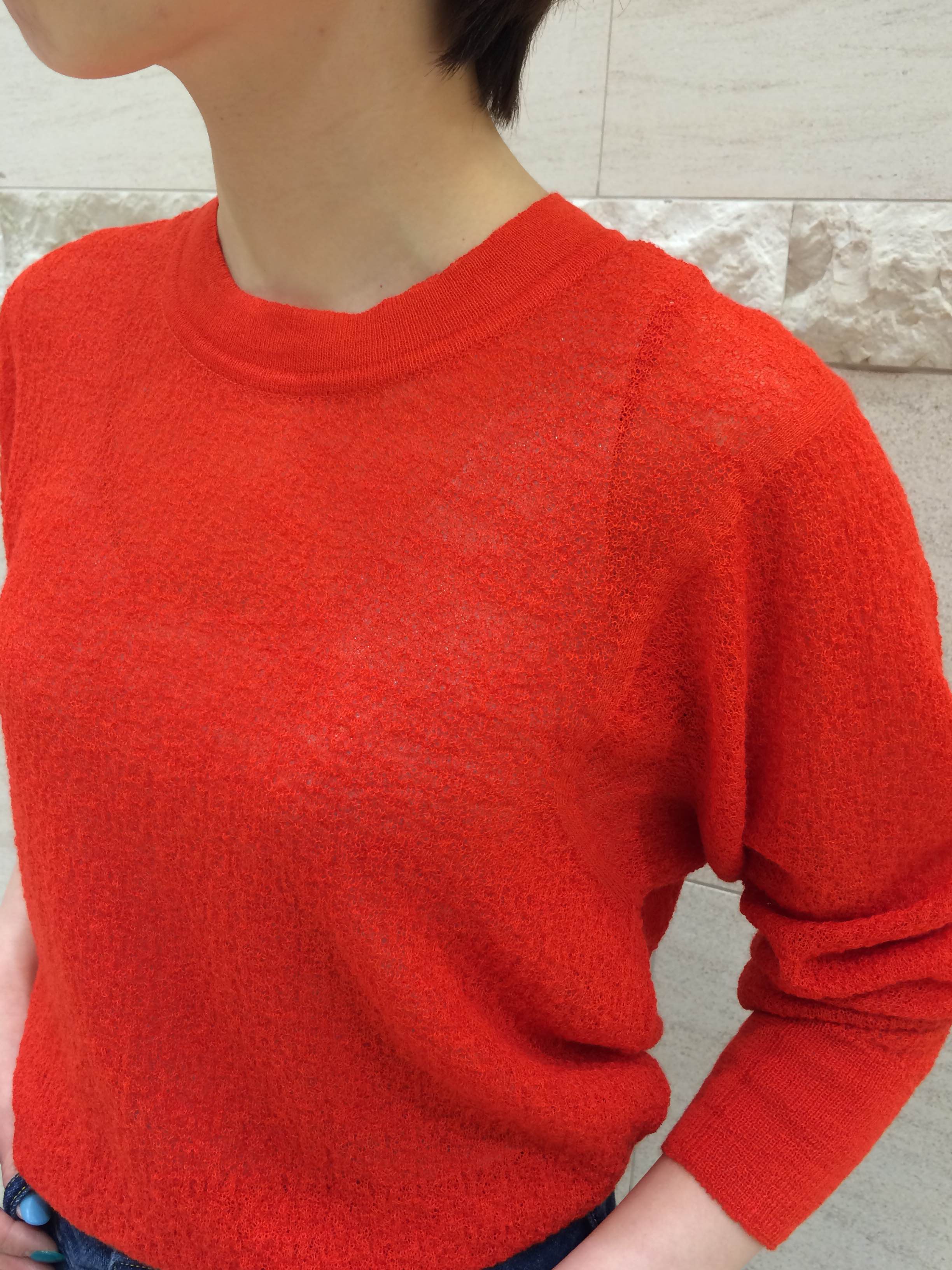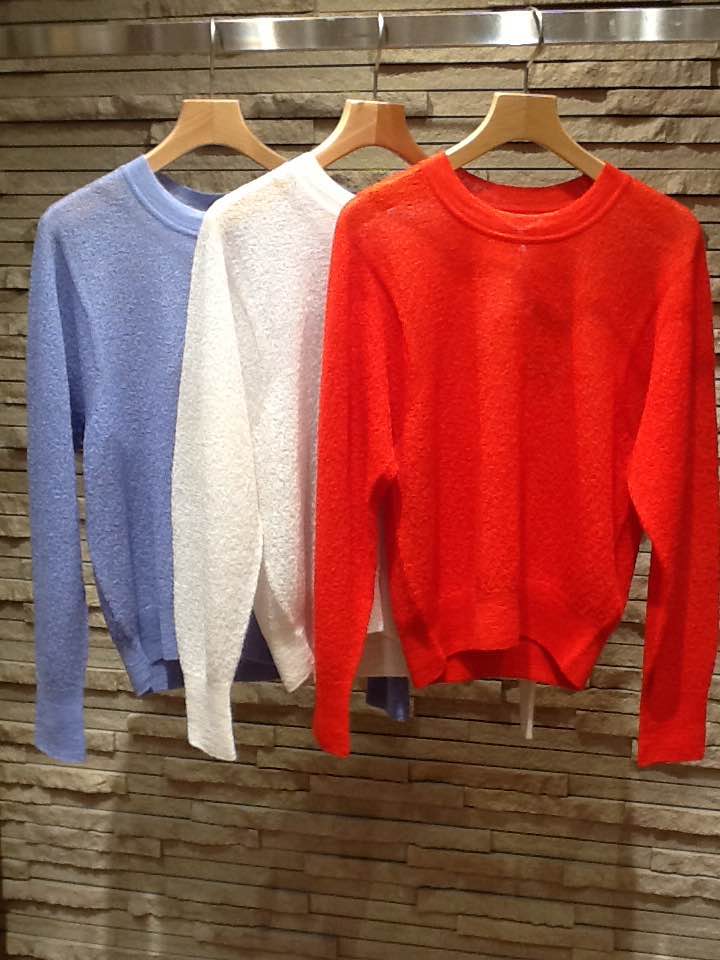 IMG_0514 クルーネックプルオーバー 型番(316-00-0136) ¥21.000(+TAX) Vネックカーディガン     型番(316-20-0088) ¥29.000(+TAX) 少し起毛感のあるふわふわの肌触りが特徴のモヘアコットンの素材。 24.5マイクロンというモヘアの中でも最も繊維の細い原毛を使った糸に極細のインド綿から撚糸した糸が、程よい透け感と独特のハリ感に。他にはない珍しい風合い。 さっそく着てみました。 IMG_4739 (1)IMG_4746IMG_4741