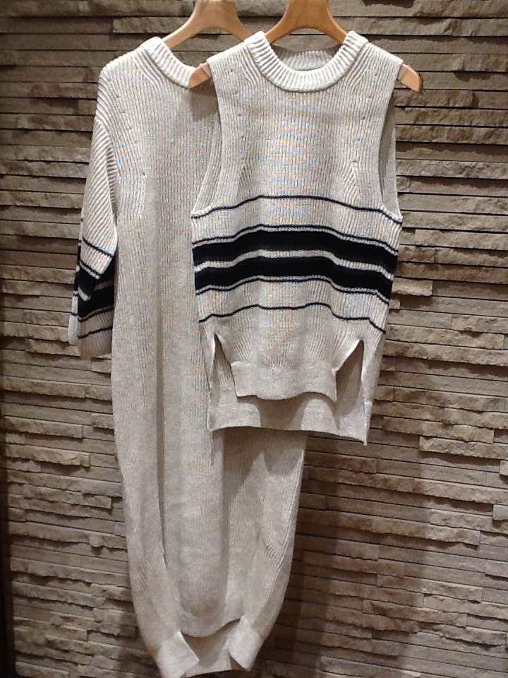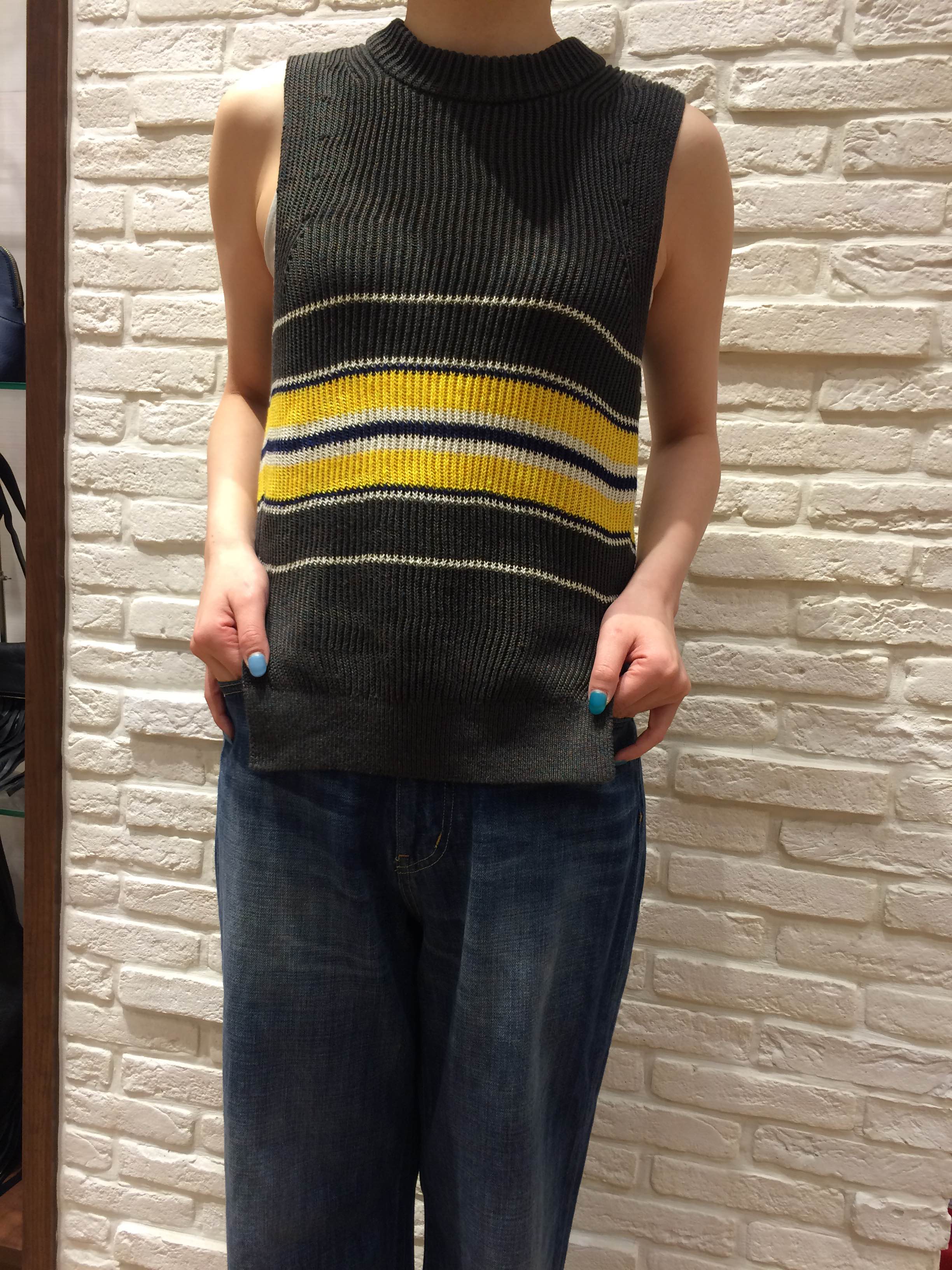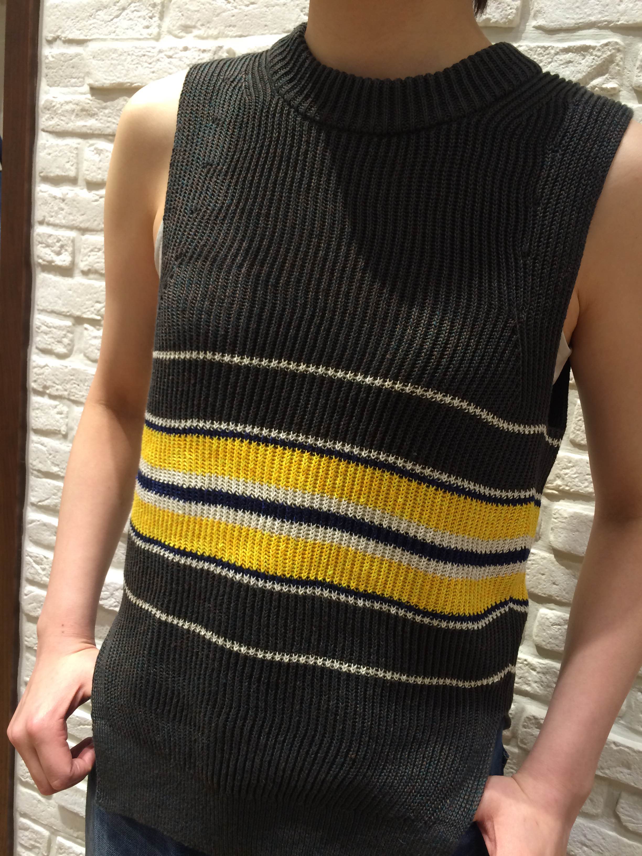 ニットベスト 型番(316-00-0134) ¥19.000(+TAX) ワンピース  型番(316-00-0135)     ¥35.000(+TAX) フランドル地方のフラックス原料を使用したリネン100%の素材。リネンのナチュラルな光沢感が美しく清涼感のあるドライな風合い。色味の近い色を8本束ねてあり、深みのある色です。IMG_4749 IMG_4752