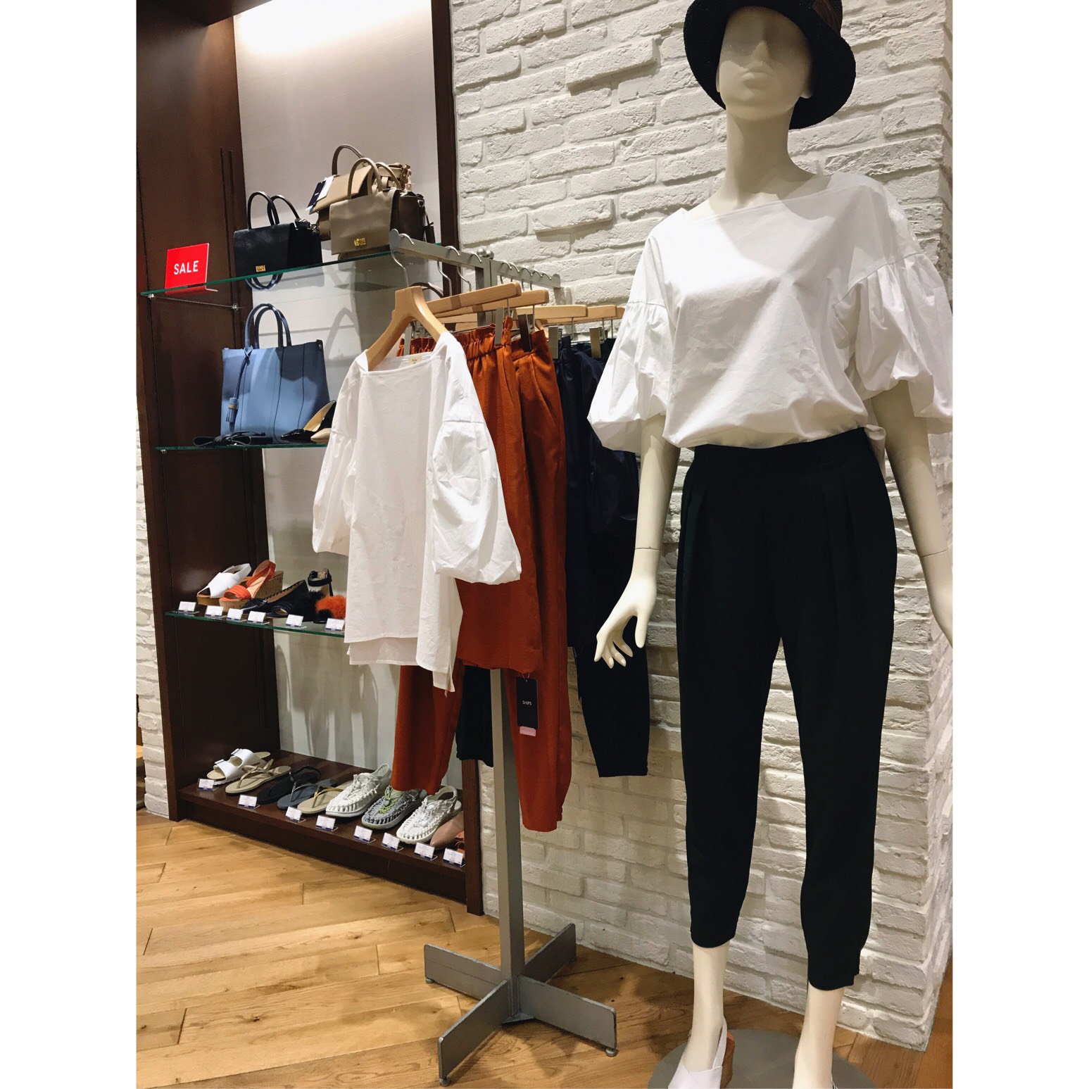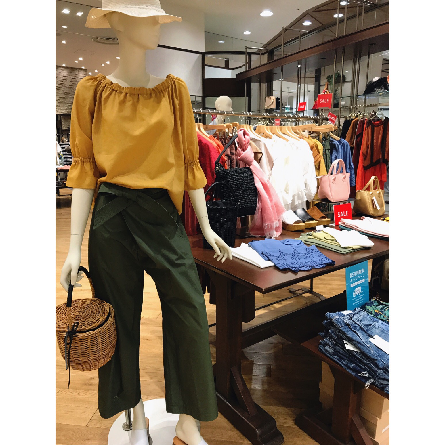 ONEPIECE(型番314-52-2067)¥11,000+tax→¥5,500(+TAX) HAT (型番318-51-0609)¥14,800+tax→¥7,400(+TAX) BAG(型番310-01-2160)¥9,200+tax→¥4,600(+TAX) 秋にも使えるブラウスやボトムなども多数取り揃えております。 IMG_9129