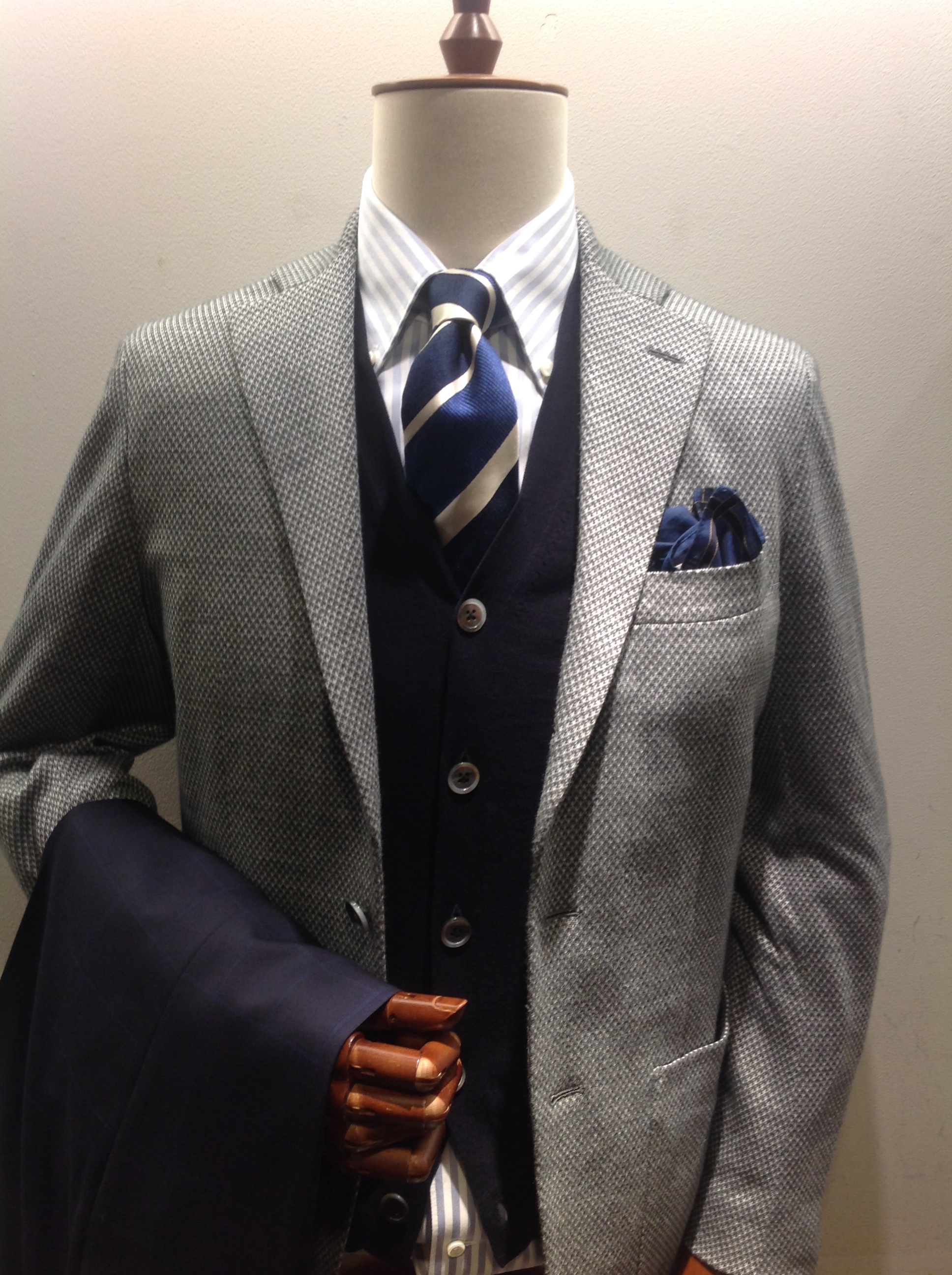 色に関しては昨年より比べ落ち着いた色に変更した事によって、より幅広いコーディネートに対応出来る仕上がりです。 シルエットはストレートラインになっており、胸周り、肩周りの窮屈さも解消されています。 更に!昨年は付けていなかった袖裏をプラスし、袖入れ時にすべりも良くなりました。 更に更に!ライナーが付いているので、冬の寒いシーズンも着用可能です。 ジャケット同様堅過ぎず、ラフ過ぎない、コーディネートによって色々な表情を出せる商品になっております。 こちらも勿論ON、OFF兼用で♪