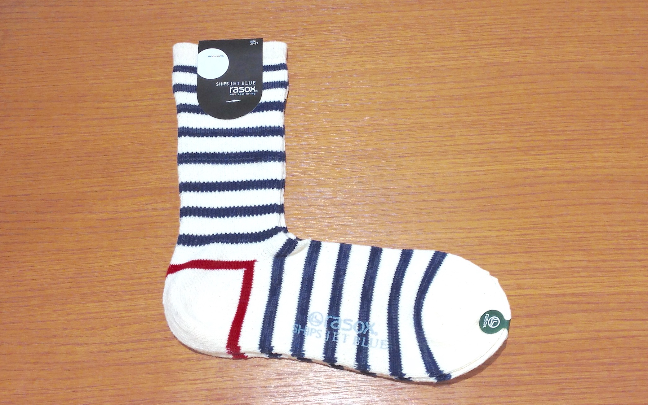 人口工学に基づいた作りにより快適な履き心地を目指したRASOXのソックスです。 ブランドの特徴とも言える直角に曲がったデザインが目を引きます。 マルチなボーダーパターンは足元のアクセントにピッタリの一足。