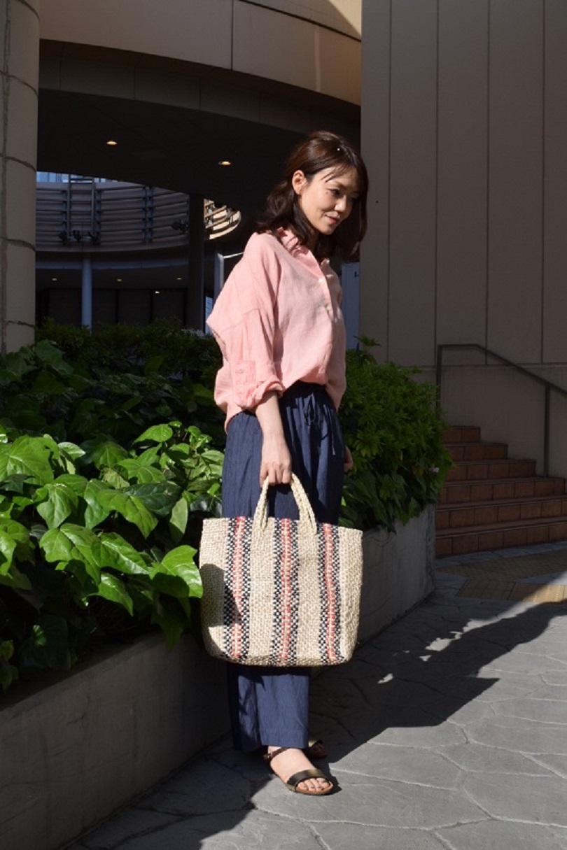 ピンクのリネン素材のシャツは通気性も良く、見た目も涼しげです。