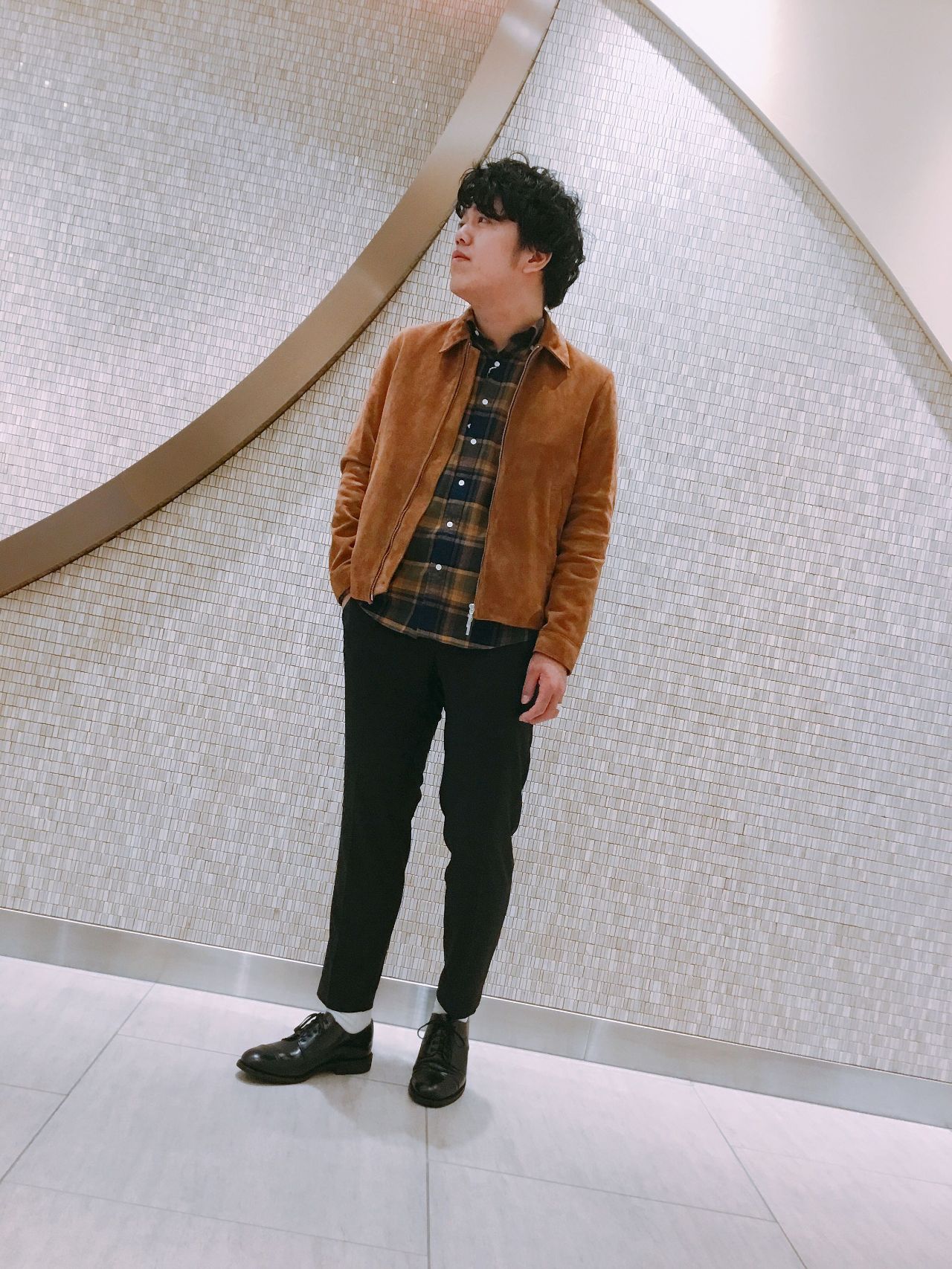 男らしいスエードジャケットにはシックにスラックスと革靴で。
