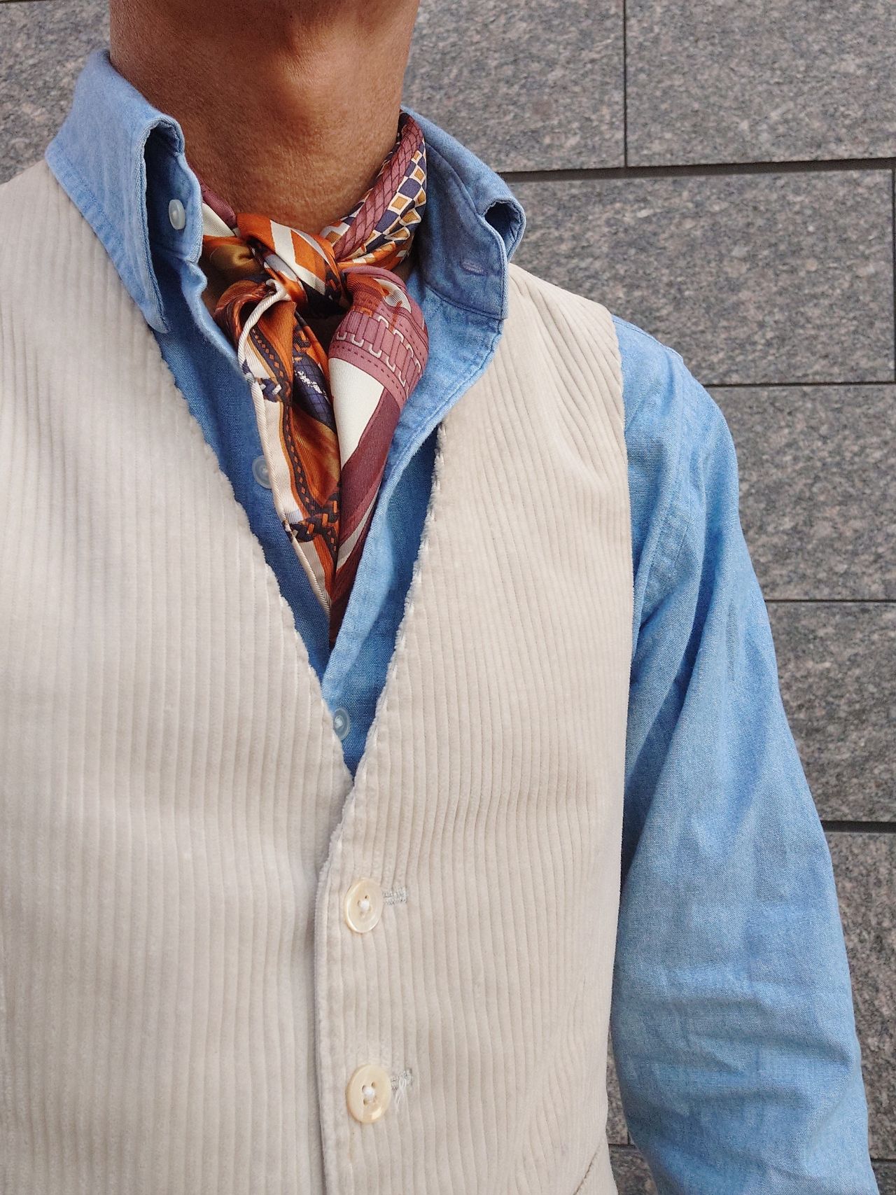 シャツのレギュラーカラーとスカーフの組み合わせの雰囲気がイメージ通りの仕上がりで大満足。