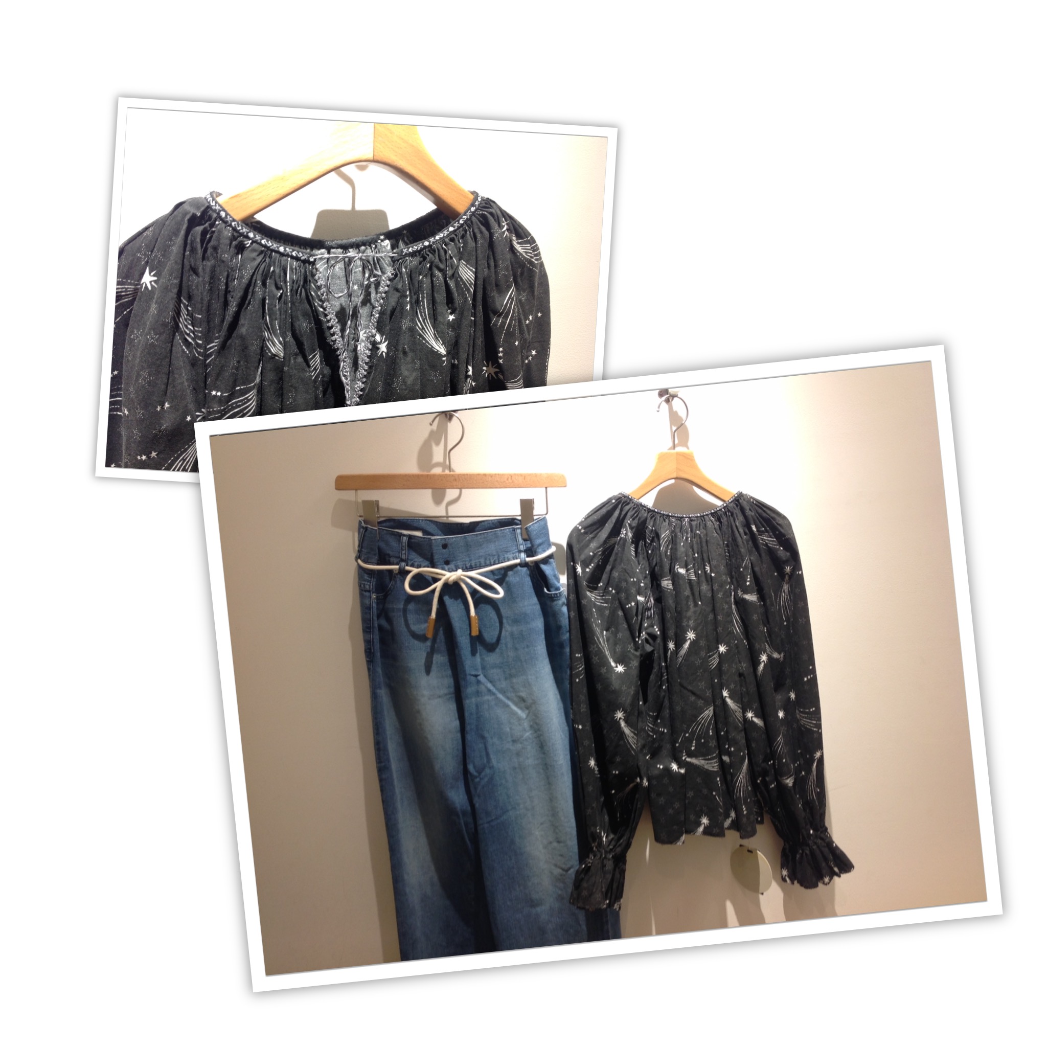 今年らしいバルーンスリーブと星のプリントが可愛いブラウス。 なんと刺繍は全て手縫いです。 お色はブラックなので大人の女性にもオススメ! & ウエストの合わせを2パターン楽しめるリラックスデニム。 ライトオンスで生地感が軽く、これからの季節にピッタリなアイテム。