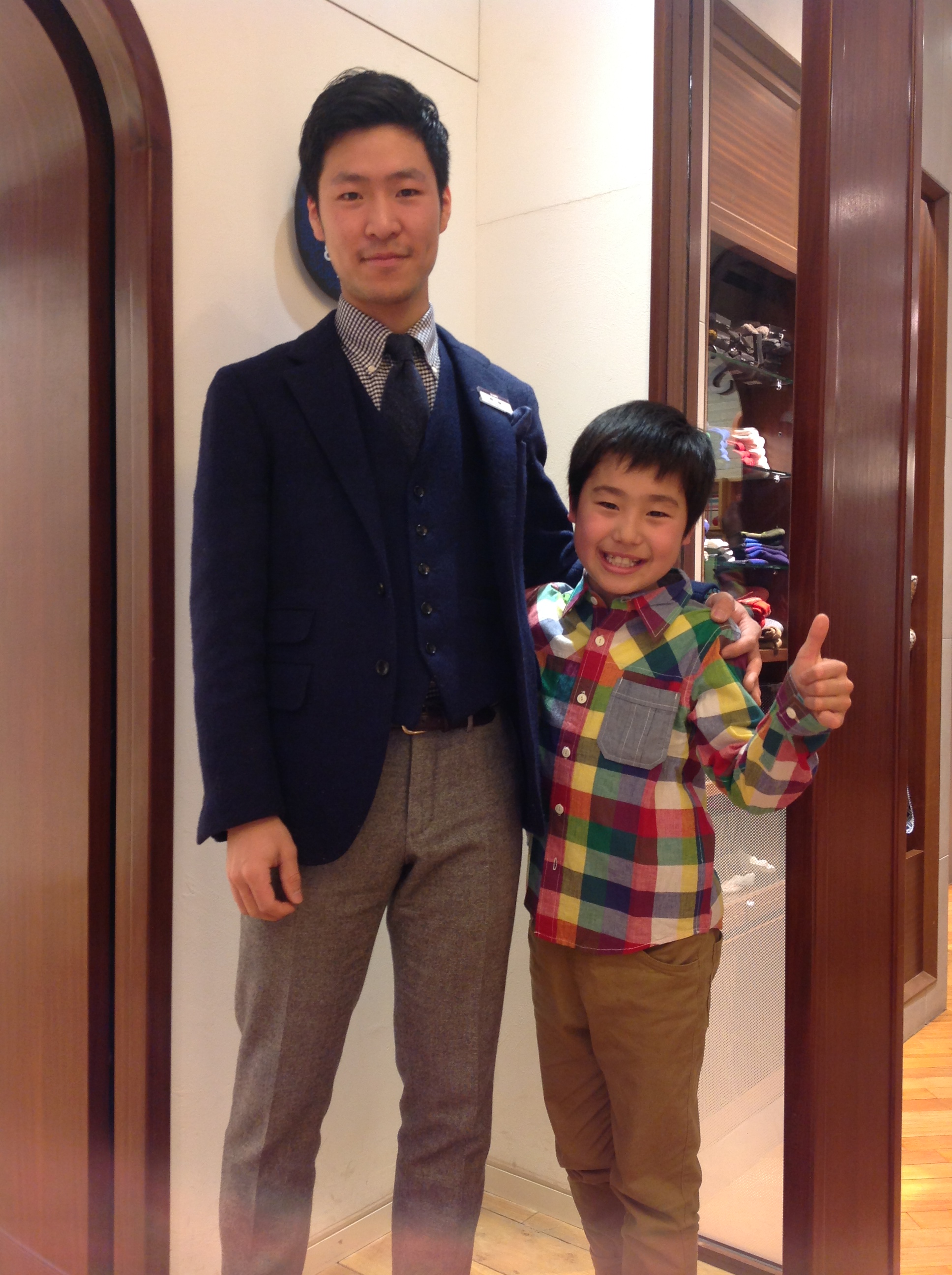 リオくん、実は三年生なので 実際の新入生はもう少し小さいシルエットになるかもしれませんが、 ギンガムチェックのシャツに、ドットのボウタイがよく合っています。 パンツはひざが隠れるくらいの長さなので、スッキリ!!