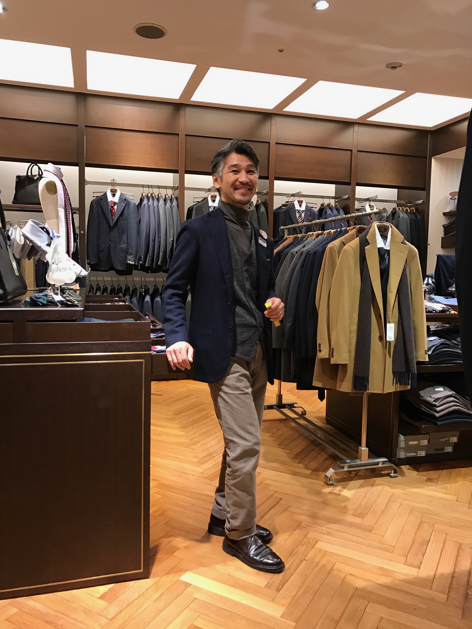 ジャケット×パンツスタイルに、インナーベストを着込む上級者テクニック。 先程の笑顔はどこへやら.. 怖い人ではありません・・ご安心下さい。