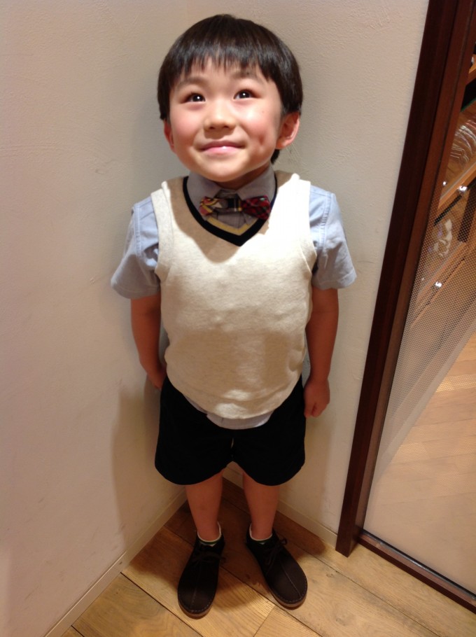 ボタンダウンシャツ ¥5.800(+TAX) コットン ベスト ¥5.500(+TAX) コットン ショートパンツ ¥6.800(+TAX) マドラスチェック ボウタイ ¥3.500(+TAX) クラークス デザートトレック ¥9.000(+TAX)