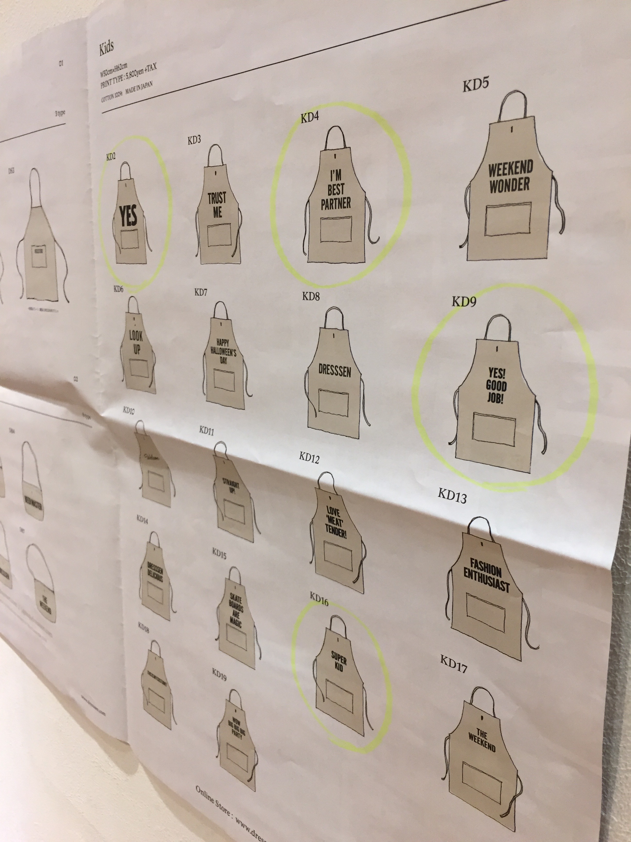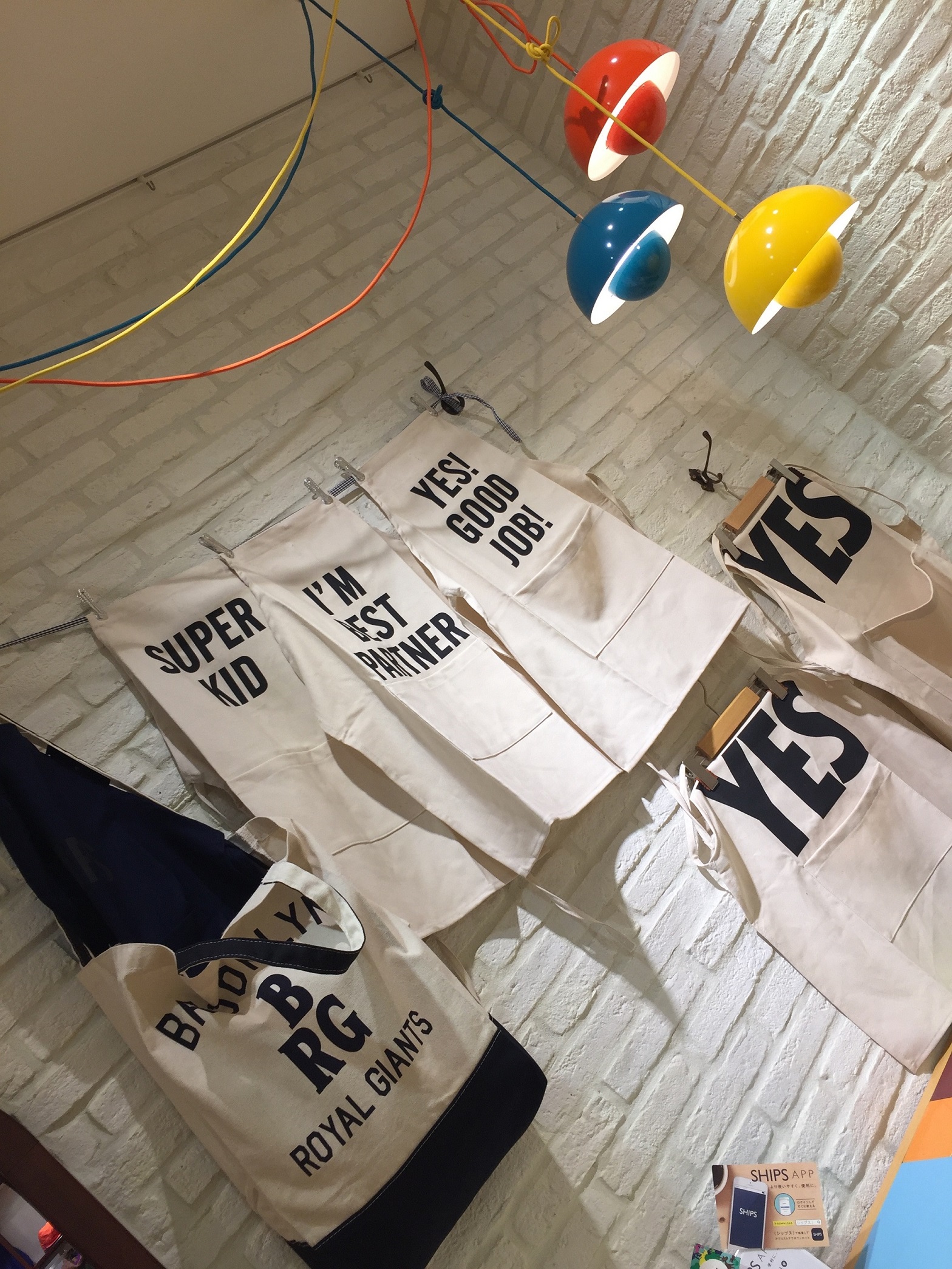 親子お揃いで付けられるのは、【YES】と、別注の【SHIPS】 のみです。 たくさん使って、たくさん汚すとどんどん良い風合いになっていくエプロン だそうです。お絵かきや工作のときに使っても可愛いですね!