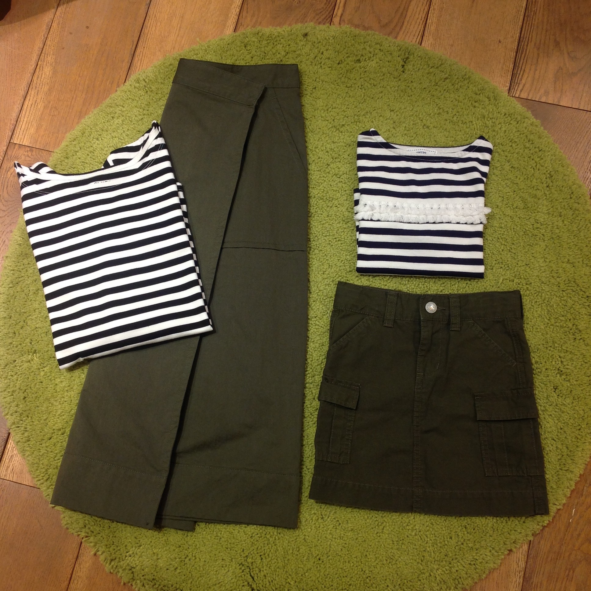【WOMENS】 CTN BORDER BOAT NECK ¥7.000(+TAX) ASYMMETRY WRAP SKIRT ¥11.000(+TAX) 【KIDS】 BORDER FRINGE TEE ¥5.500(+TAX) CARGO SKIRT ¥7.800(+TAX) 定番のボーダーカットソーにラップスカートのコーディネイト。 ラップスカート自然なAラインのスカートでとても履きやすいです。(S.M.L展開)