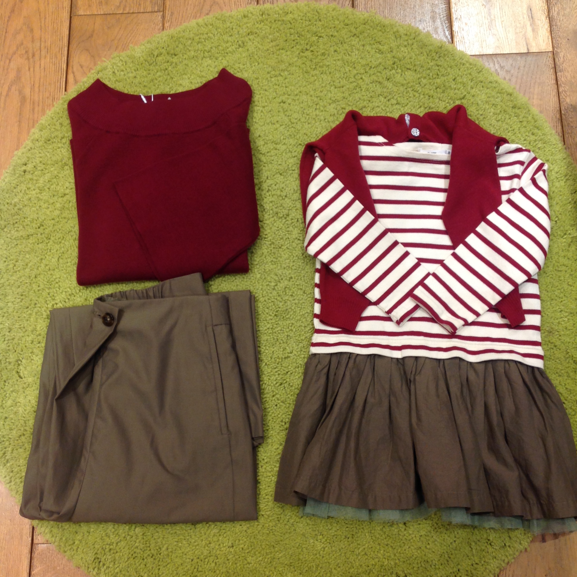 【WOMENS】 フレアースリーブプルオーバー ¥12.900(+TAX) スラントパンツ ¥14.000(+TAX) 【KIDS】 LIBERTY カーディガン ¥5.500(+TAX) BORDER ONEPEACE ¥7.500(+TAX) フロントがななめに合わさったデザインがポイントのパンツは、程良いハリ感がスッキリとした綺麗なシルエットを作りだしています。ウエストは後ろゴム仕様なのでラクチンです。 今期イチオシのワインレッドを指し色にして色あわせしてみては?? おばあちゃんも、カジュアルスタイルで若々しく決めてみましょう。 ウエストがゴムのものや、広がりのあるスカートでしたらきっと気に入って いただけるのではないでしょうか。 なんといってもお孫さんとお揃いです★ 嬉しいはずですね☆