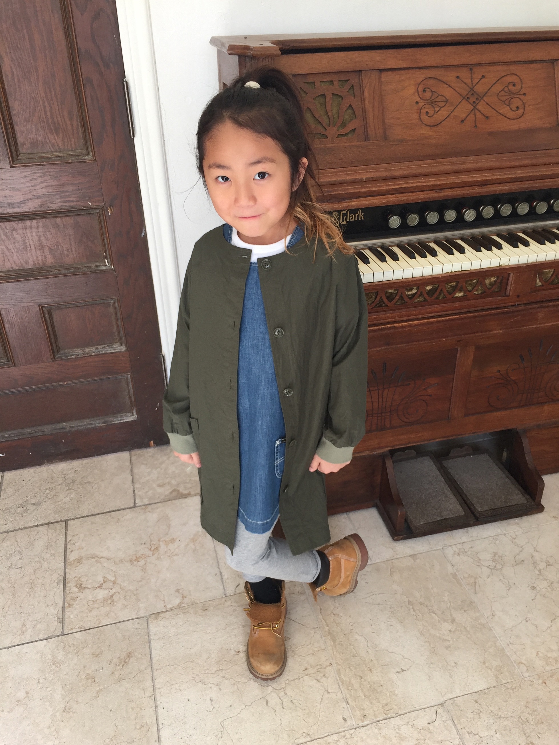 前後どちらにしても着られるワンピースを羽織ってみました。 中に着ているLEEのDENIM ONE-PEACEはSHIPS KIDS別注です。