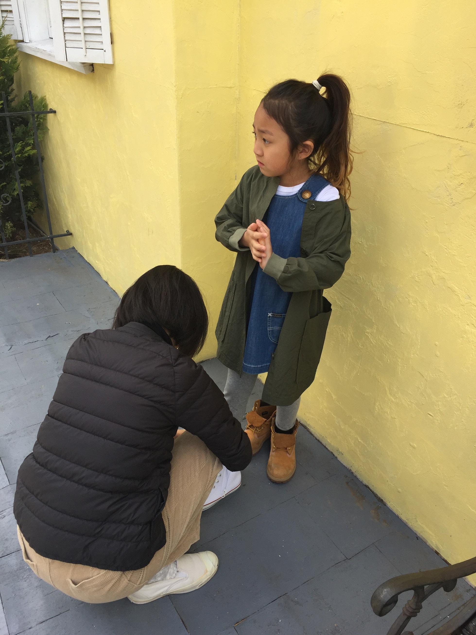 真っ白いコンバースに履き替えて。 撮影スタート!! さすがに彼女は慣れっこで、すぐに一枚目をとり終えました。 自分よりも、ふーとくんがどんな格好になるのか気になって仕方が無い様子です。