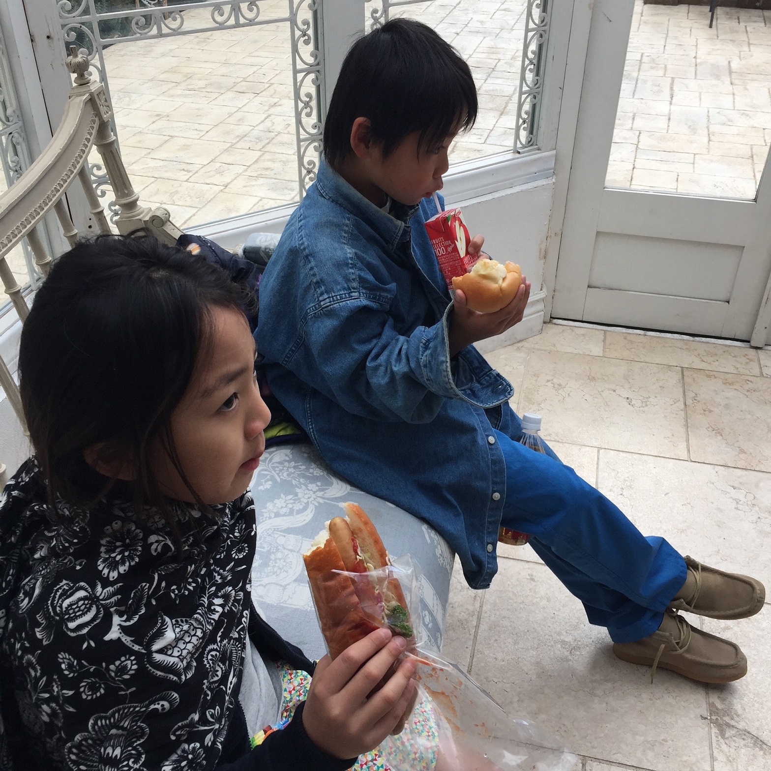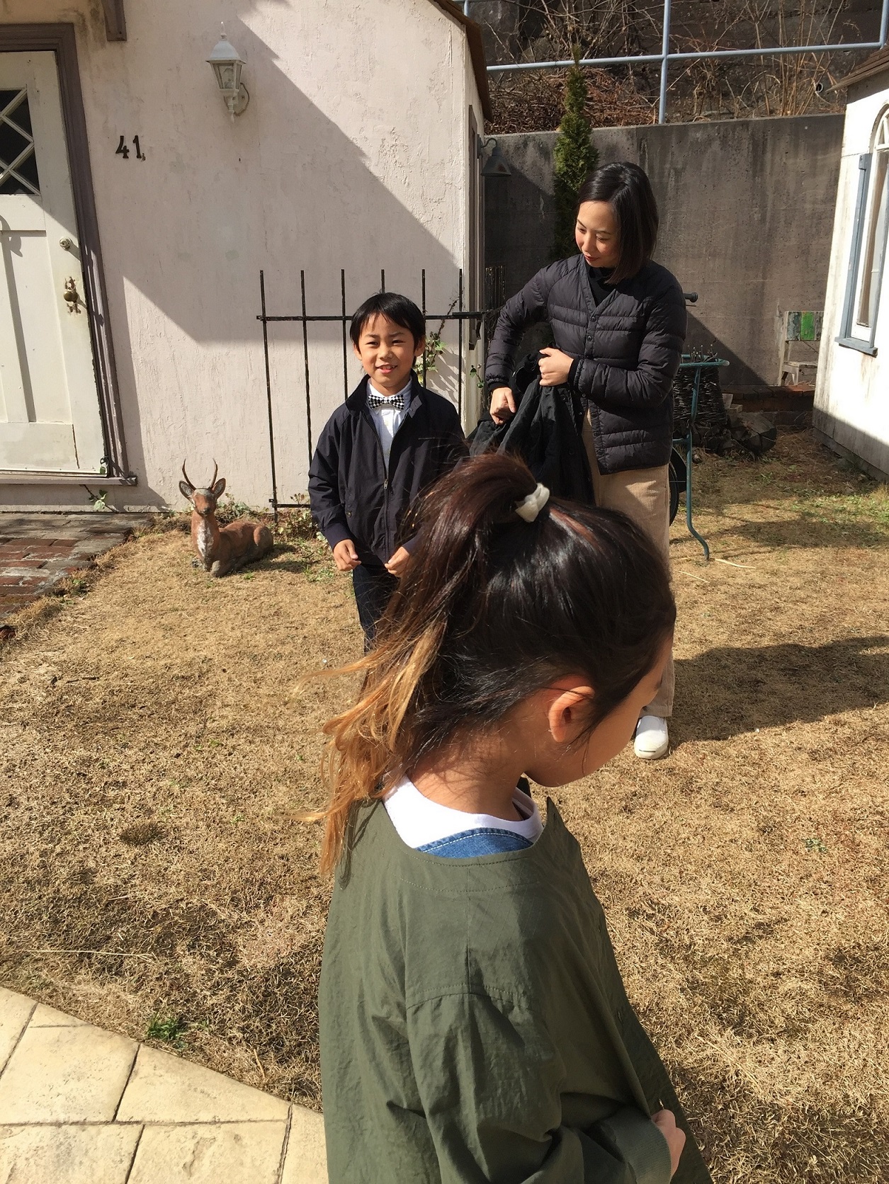 しかし!!お日様が隠れてしまって寒い!!!! しかも、風邪が強くなり笑顔を作ってもあごがガクガク言ってしまって なかなか写真が撮れず。 ということで一旦暖かいお部屋に戻って休憩することになりました。 でも、絶対にこぼさないで!! 汚さないで!!! と言われ、大人の洋服を巻かれ恐る恐るパンを食べる2人。