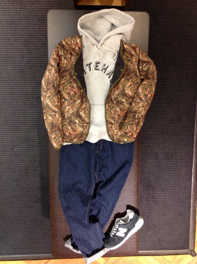 SHIPS: O.X B.D SHIRT ¥6.200(+TAX) THE DAY: PRINT FOODIE SWEAT ¥7.800(+TAX) SNUGPAK: LINER JACKET ¥20.000(+TAX) SHIPS: DENIM 5PKT JEANS ¥7.000(+TAX)