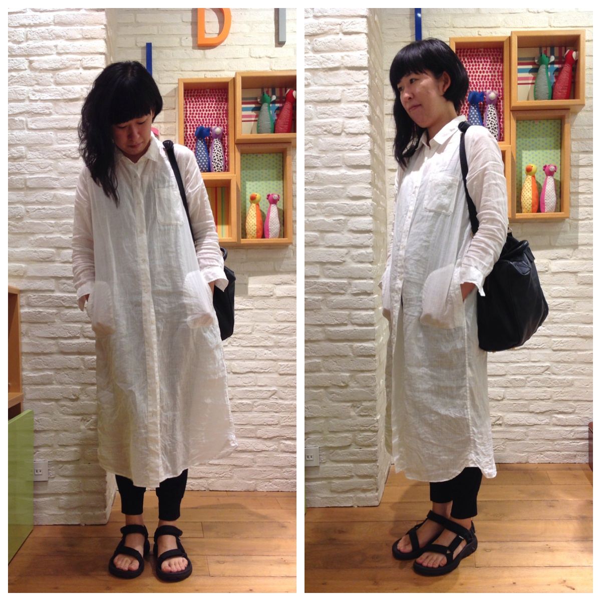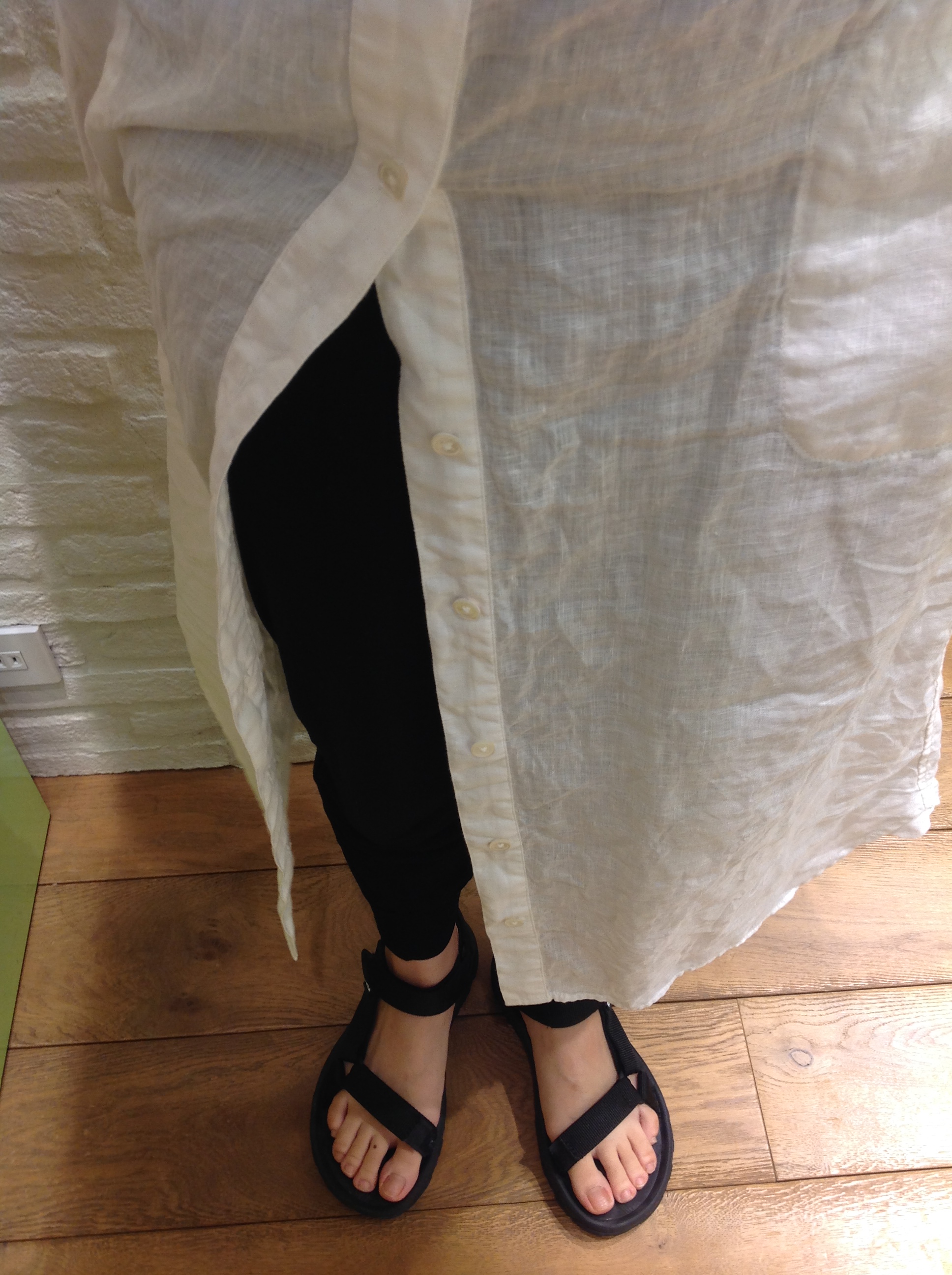 リネンの白いワンピースの下の黒いパンツ。