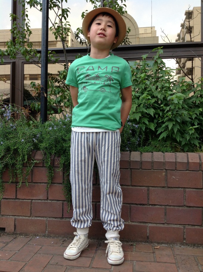 『ストライプのパンツをとてもお洒落にきこなしてます。 グリーンのTEEシャツとの色合いも、素敵だったので選びました。』