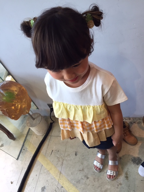 1ポーズ目はこちら。 夏らしいパイナップルのヘアゴムと、フリフリのTEEシャツ。