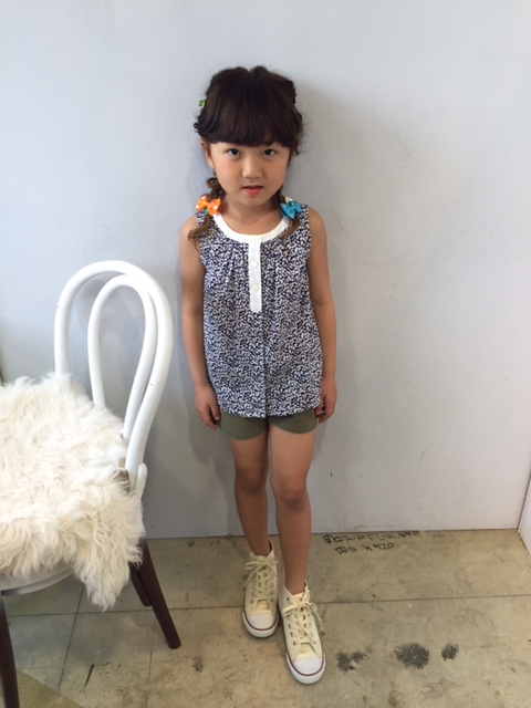 今流行のクルリンパヘアーです。 リバティープリントのシャツと、ショーツに、たくさんのアクセサリー でとてもにぎやか!!