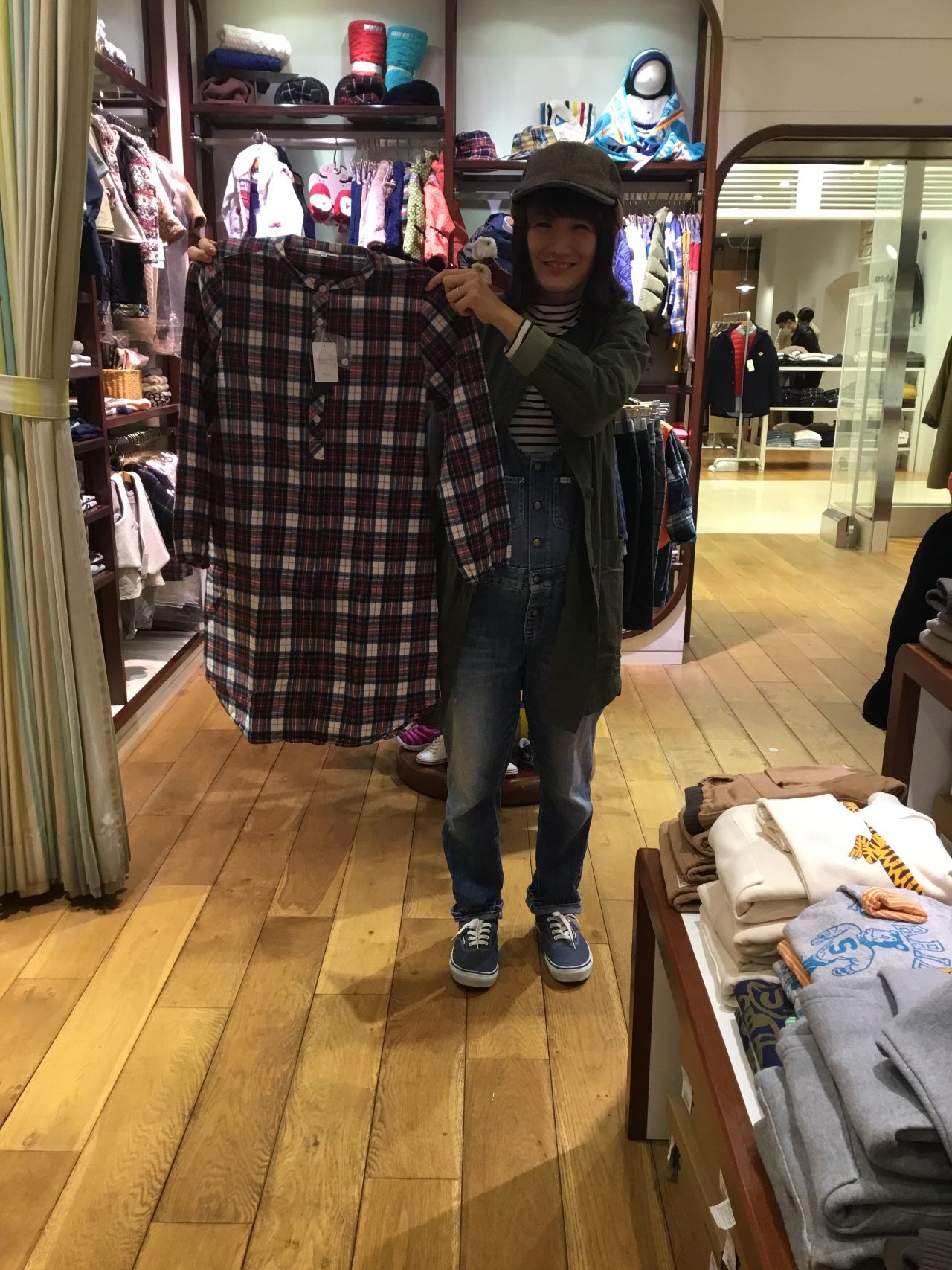 手に持っているチェックのワンピース、150㎝は前開きなのでこちらも羽織るようにして着ることが出来ます。