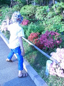 真ん中に池があり、お花がいっぱい咲いている屋上庭園があります。 逆光にも負けず、外に出るとすぐにピースサイン! そして全速力!!!!
